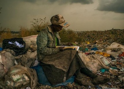 米凯·阿尔伯特是美国一名自由摄影师,2012年6月的一天,他在肯尼亚首都内罗毕旅游,经过一处约15公顷大的垃圾场时,一个不可思议的情景映入他的眼帘:一个靠捡拾垃圾卖钱为生的妇女,头顶鸭舌帽,身着长袖夹克,腰围长裙,戴着手套,腿套长袜,脚穿线绑鞋,正坐在如山的垃圾堆上一个蓝色塑料袋上,聚精会神地阅读一本捡来的书。此时,天空悬浮着乌云,一场暴雨即将降落,但这些丝毫没有影响她遨游于知识海洋的专注……米凯迅速端起相机,凝神屏气按下快门,记录下了这个震撼人心的镜头。也许是闪光灯的耀眼光芒惊扰了那个妇女,她抬头望了一下端着相机的米凯,然后便粲然地笑了。
