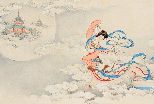 嫦娥吞下药,身子立时飘离地面、冲出窗口,向天上飞去。由于嫦娥牵挂着丈夫,便飞落到离人间最近的月亮上成了仙。