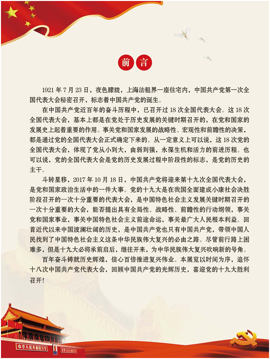 展览简介:自1921年至今,党团结并领导全国各族人民英勇奋斗,使中国的面貌发生了翻天覆地的变化。中国从战乱频仍、四分五裂、极度贫弱、备受凌辱、濒临灭亡的边缘,到实现国家(除台湾等岛屿之外)的统一,中华民族以独立、统一、自主、团结的姿态,重新峻立在世界东方,并大踏步走向繁荣富强,成为在当今世界舞台上具有举足轻重地位,在政治、经济、军事和文化力量等方面强劲发展的一个举世瞩目的国家。站在新的历史起点上,展望未来,任重道远。我们每一个共产党员,每一个中华人民共和国的公民,都应该从为祖国的繁荣、社会的发展、人民的幸福、人类的进步做出更大的贡献。2017年是中国共产党诞生96周年,党的十九大召开之年。在喜迎十九大之际,本展览力图以图文结合的形式形象立体的记述了中国共产党一大以来取得了辉煌成就,以带领读者回顾党的历史,永远铭记革命先辈的英名和丰功伟绩、缅怀他们的精神和风范。