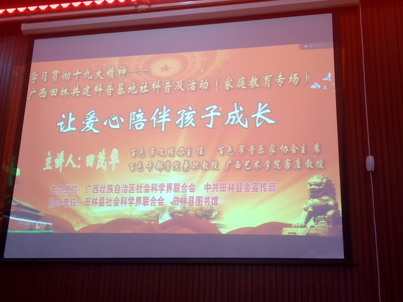 按照自治区社科联2017年与田林共建社会科学普及基地工作要求,我馆与县社科联于2017年10月21日,在田林初级中学举办以《上爱心陪伴出孩子成长》为主题的第2期共建基地社科普及活动。此次活动共有师生、家长500余人参加。
