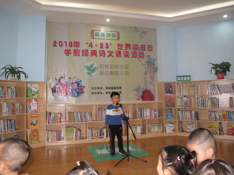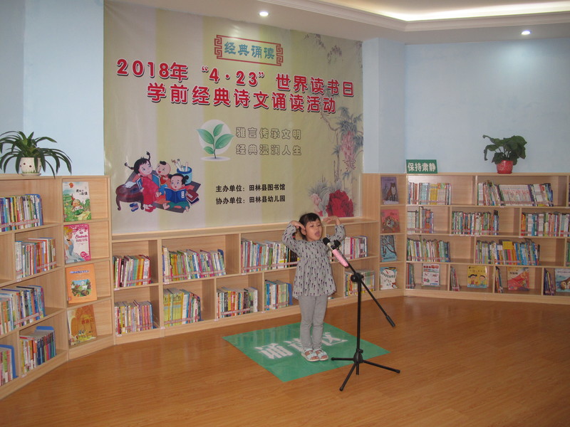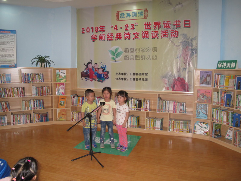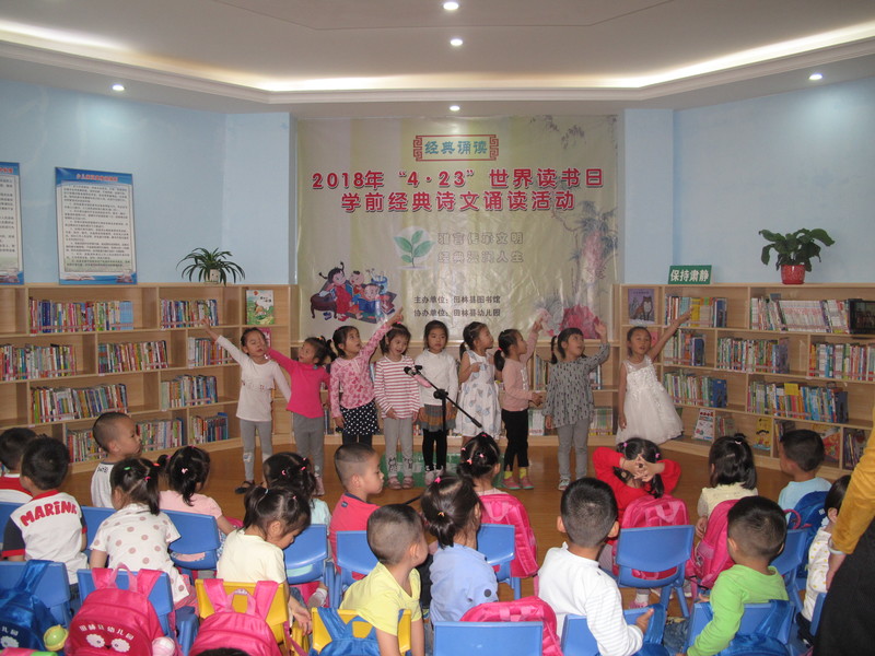 在2018年世界读书日期间,为营造全民阅读的浓厚阅读氛围,让阅读活动走进各类群体,让诵读经典活动走进幼儿园,继承和弘扬优秀民族文化传统。我馆在县幼儿园的协办下,于4月28日下午,在我馆一楼少儿阅览室开展学前经典诗文诵读活动,来自县幼儿园的80名小朋友参加了本次活动。