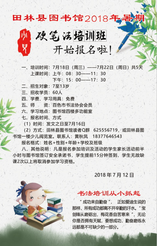田林县图书馆2018年暑假硬笔书法培训班开始报名啦!