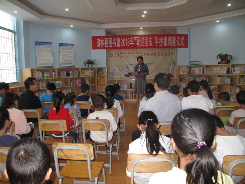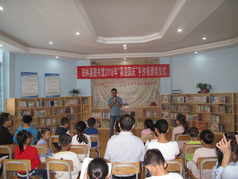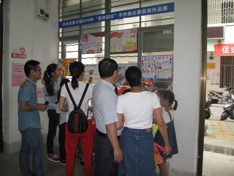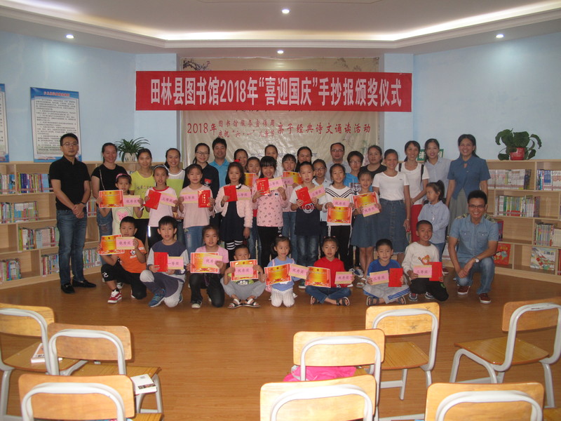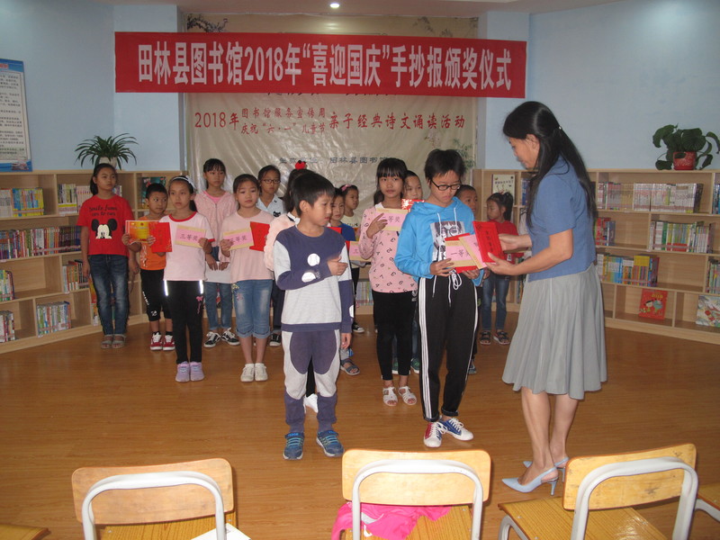 为营造浓厚的国庆节氛围,我馆举办以“中国精神”为主题的手抄报活动。活动受到了小朋友和家长的青睐,共收到参赛作品22幅,参赛作品设计形式活泼、内容丰富,作品中饱含着小朋友们对祖国母亲69周年华诞到来的喜悦之情与爱国之心。邀请县文化馆黄寿恒副馆长等人对作品进行了评比遴选,最终评出一等奖2名,二等2名,三等奖5名,优秀奖12名。其中乐里一小五年级的吴睿哲、初级中学黄思思两位同学获得一等奖。颁奖仪式上对获奖学生颁发了证书和奖金,黄寿恒评委对参赛作品进行了总的点评,使孩子们明白了优秀作品应该具备的要素和亮点,并指出本次作品的不足之处。