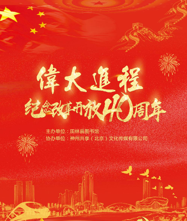 2018年12月26 日,由田林县图书馆主办,神州共享(北京)文化传媒有限公司协办的《伟大进程——纪念改革开放四十周年》主题展活动在田林县图书馆圆满举行。