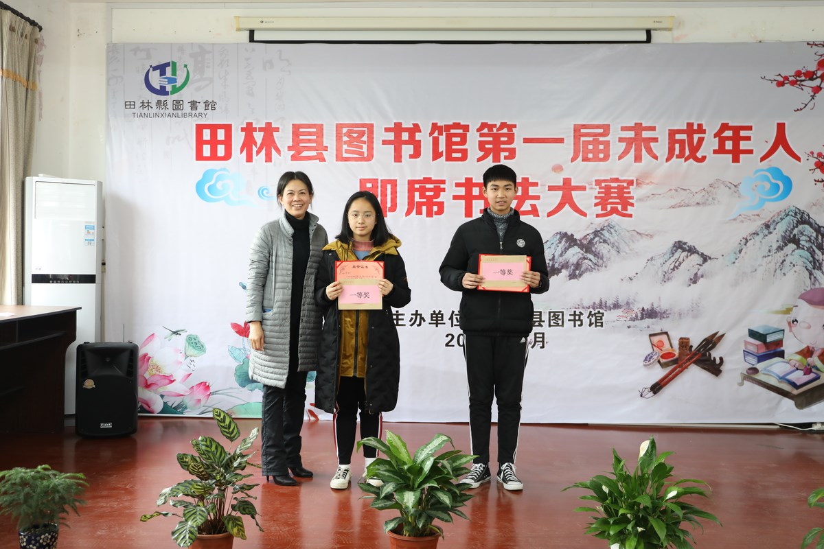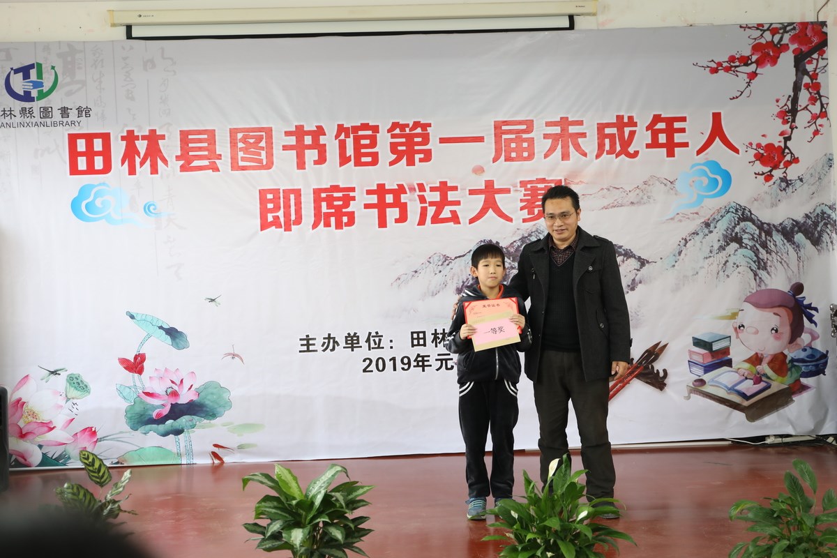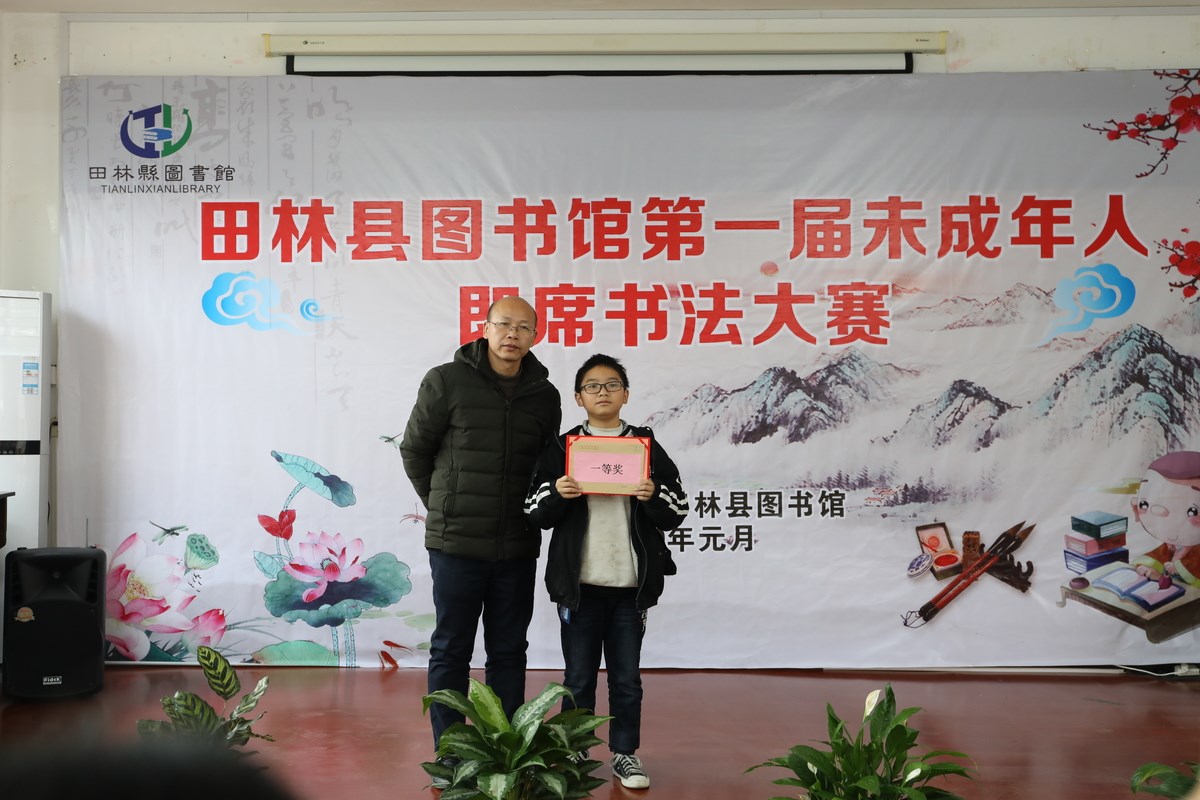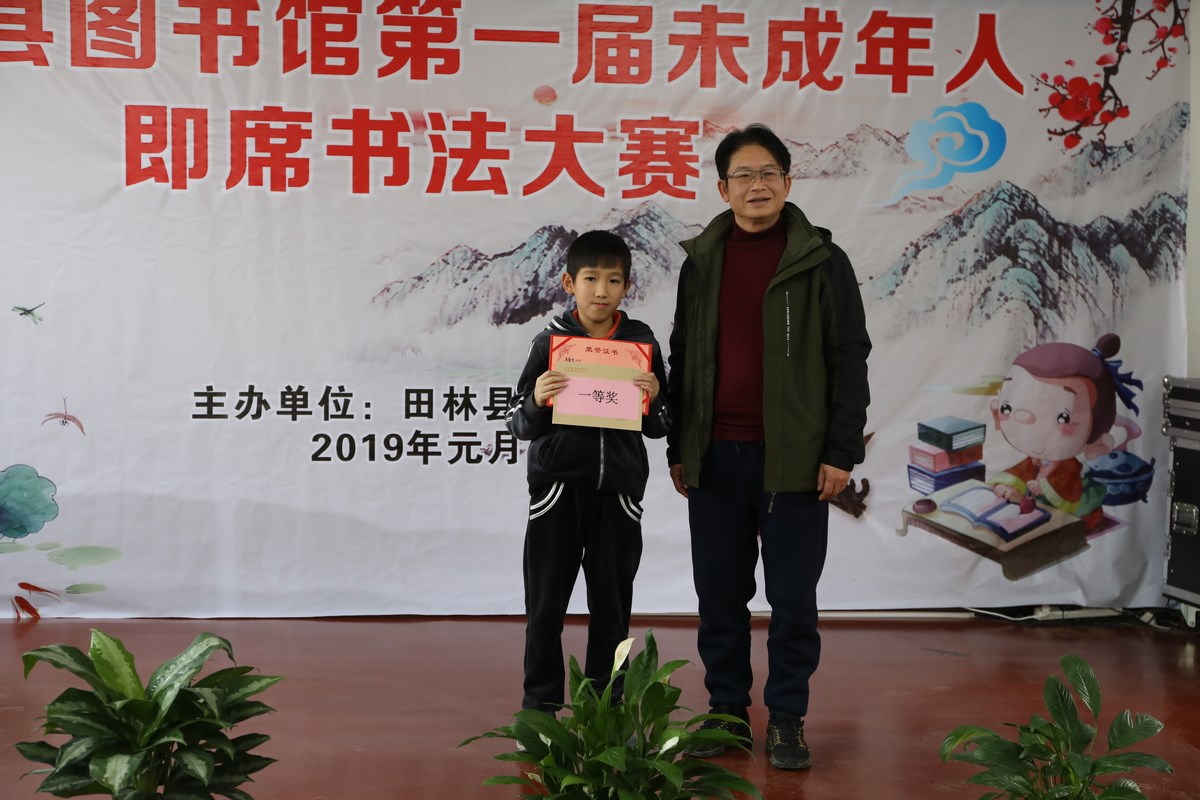 此次比赛作品评奖设置分中学组和小学组,硬笔、毛笔种。参赛作品由中国书法协会注册书法老师杨秀川、田林县书法协会负责人周子健、百色市书法协会会员向子崇等老师评审。经公平、公正评审,终评出1~3等奖50名。即:一是硬笔书法获奖33名。其中吴睿哲斩获小学组硬笔书法家一等奖,吴金亮、王心怡等2人斩获中学硬笔书法组一等奖,二等奖10人(中学组6人、小学组4人),三等奖20人(中学组11人、小学组9人);二是毛笔组获奖17人,其中杨泽新、吴睿哲等2人分别斩获中小学毛笔一等奖,二等奖5人(中学组2人、小学组3人),三等奖10人(中学组2人、小学组8人)。