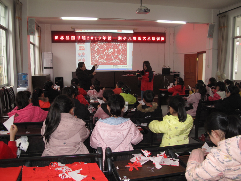 剪纸是以刀、剪为工具,在纸、箔等材料上纯手工创造的一种镂空艺术,是民间优秀传统文化。2006年,剪纸艺术被列入第一批国家级非物质文化遗产名录。为弘扬传统文化,丰富少儿寒假文化生活,在元宵节即将来临之际,我馆于2月17-18日,在本馆四楼多功能室举办少儿剪纸艺术学习培训班,来自各小学校的30位学生参加了培训学习,年龄跨度为6~12岁。
