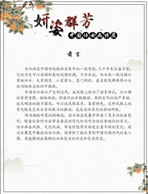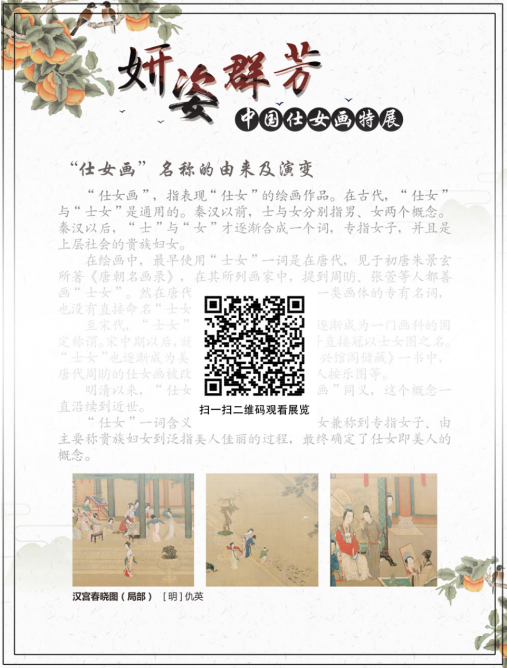 仕女画是中国传统绘画宝库中的一枝奇葩,几千年长盛不衰。自战国东周时期已见绉形,其形成于晋代,发展于唐代,成熟于五代。于今来说,仕女画一般泛指以贵族妇女、大家闺秀、小家碧玉、蓬门金钗,以及歌妓舞娘等以女性为表现主题的中国画。 中国古代仕女画从产生到近代,在风格上经历了诸多样式,从六朝的秀骨清像、面短而艳,到唐代的丰肥腴丽,再到宋代的端严秀丽,延及明清的弱不禁风,可以说风格各异,各有特色。这种风格.上的变化既是艺术自身内驱力的推动,也是世风变化的影响所致。因为描绘对象的特殊性,仕女画在发展中附着了更多的社会色彩。随着社会对女性审美要求的变化和历代女性社会地位的变迁,仕女画在风格、文化内涵、审美价值等方面发生着不同的变化。通过本展览中展出的每幅仕女国画,每位读者除了能欣赏到中国历朝历代中的美人,更能解读出每幅仕女画背后历史和艺术信息。在中国几千年的男权封建社会历史里,大门不出二门不迈,无才便是德的女性和今天撑起半边天的女性是截然的对比。今天的三八妇女节与其他节日有着鲜明的性别属性,更是彰显了今天妇女在社会.上的重要地位。