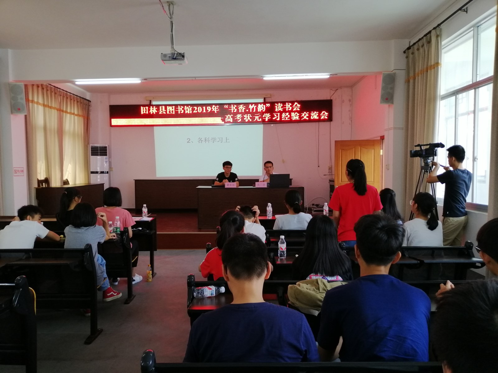 本次学习经验分享交流会,我馆邀请了田林籍2019年祈福高中理科状元吴三泷(高考成绩670分,中央财经大学录取)、百色民高文科学霸谢承延(高考成绩586分,首都师范大学录取)等2位同学为分享嘉宾。此次交流会设置有嘉宾分享读书学习方法经验介绍、学员与嘉宾互动交流2个环节。