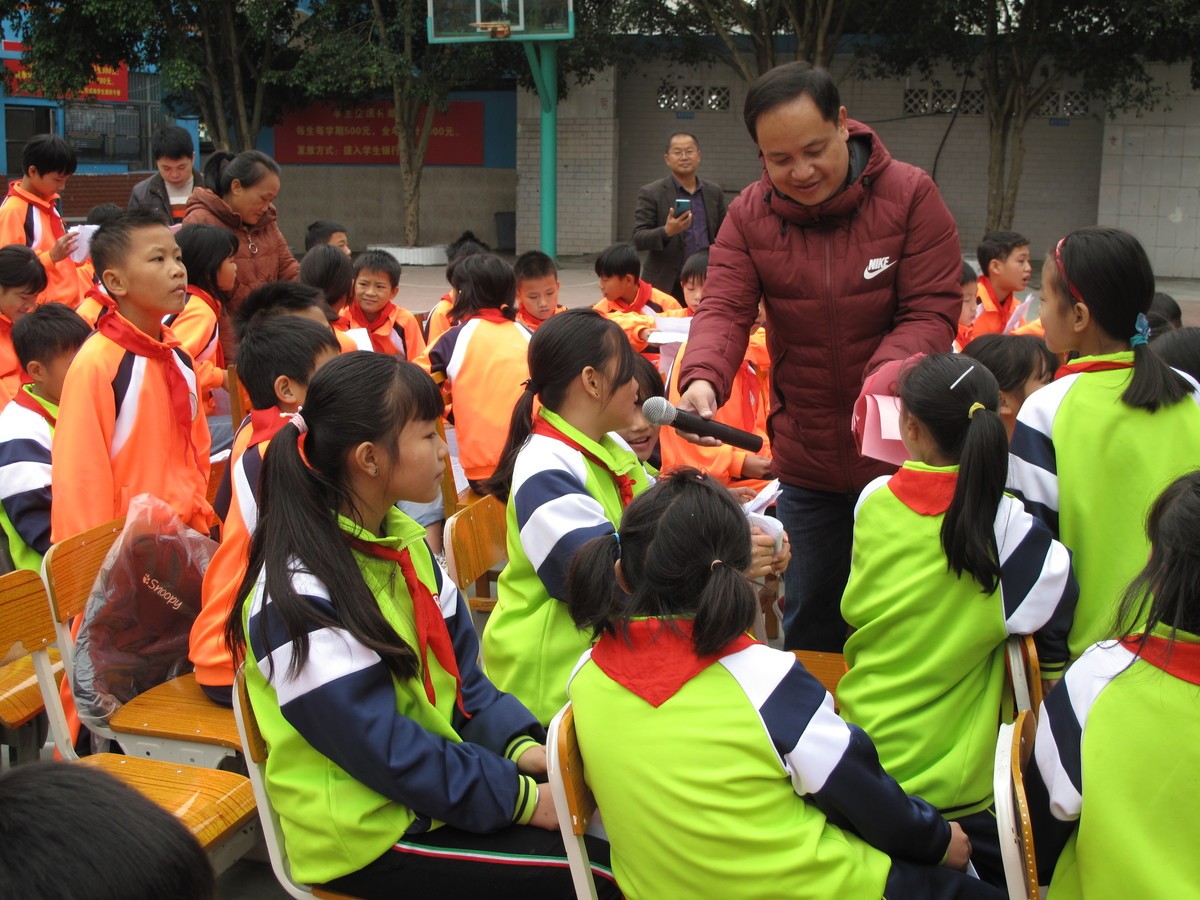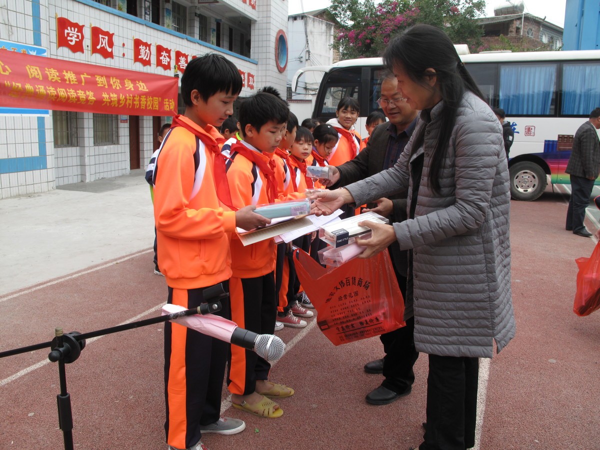 图为 馆、校领导给参加诵读活动的孩子赠送纪念品