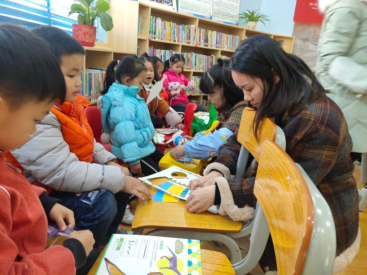 图为 县幼老师和馆员协助小朋友们制作手工