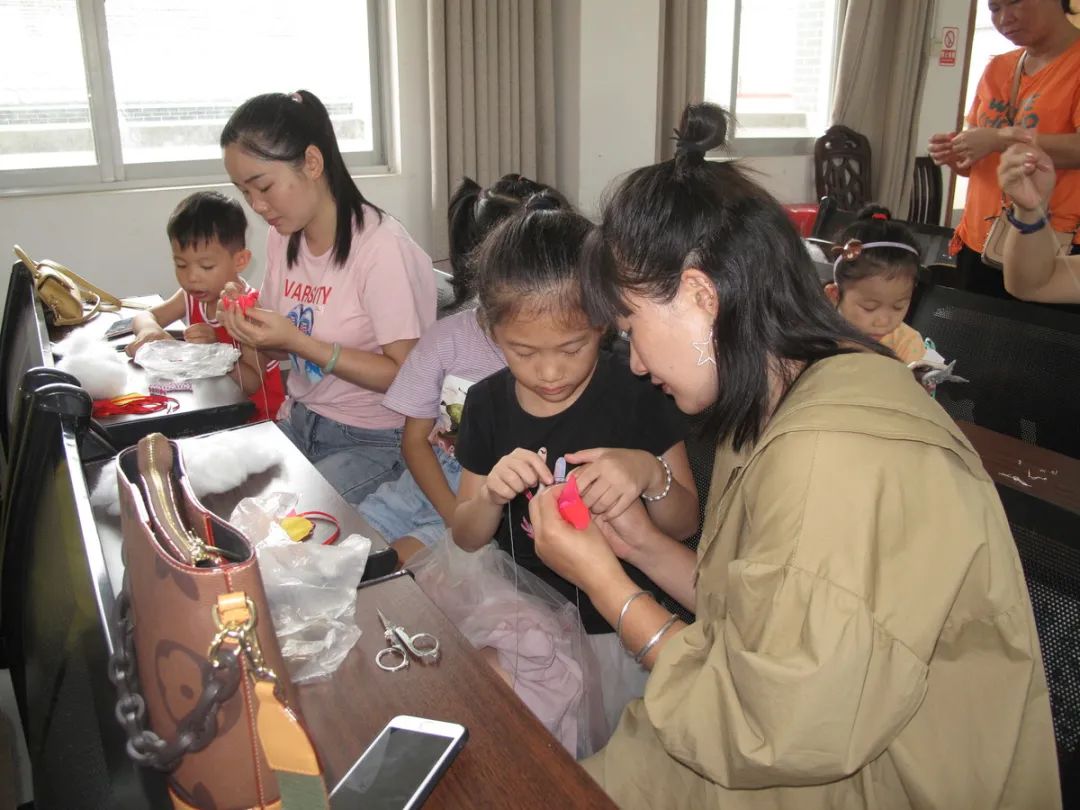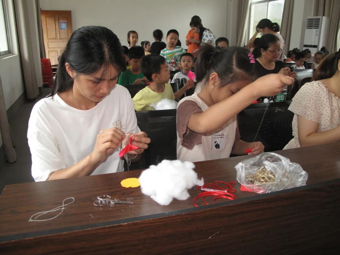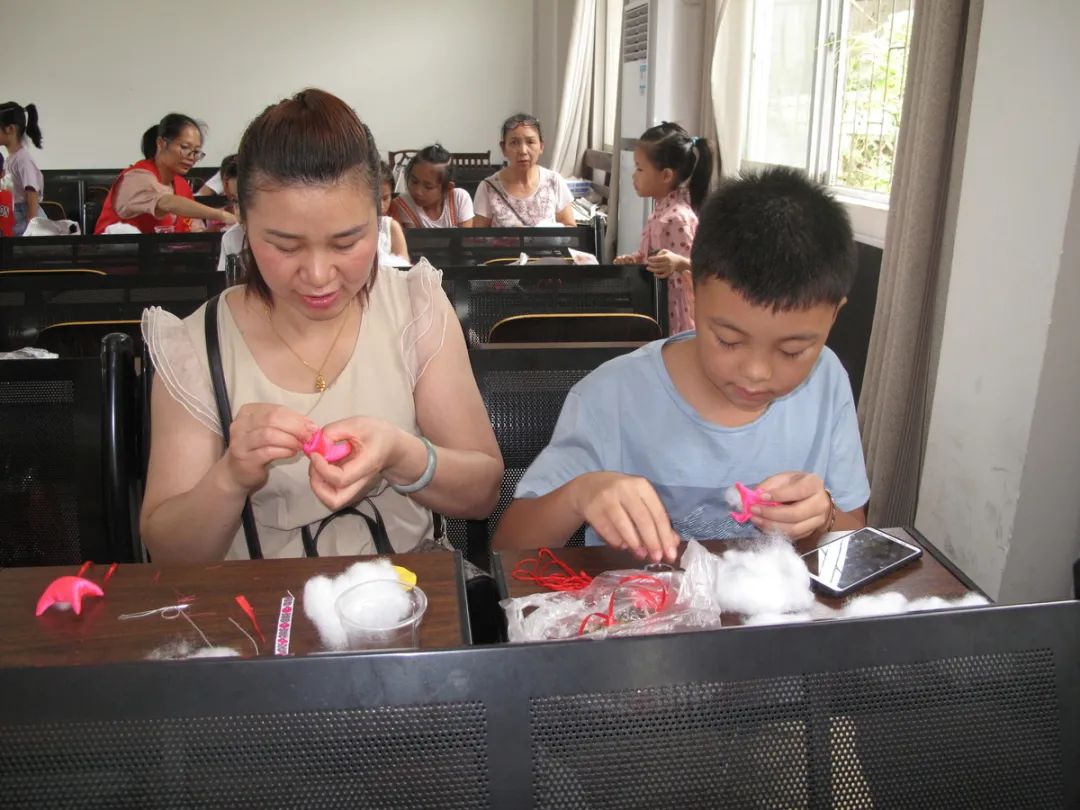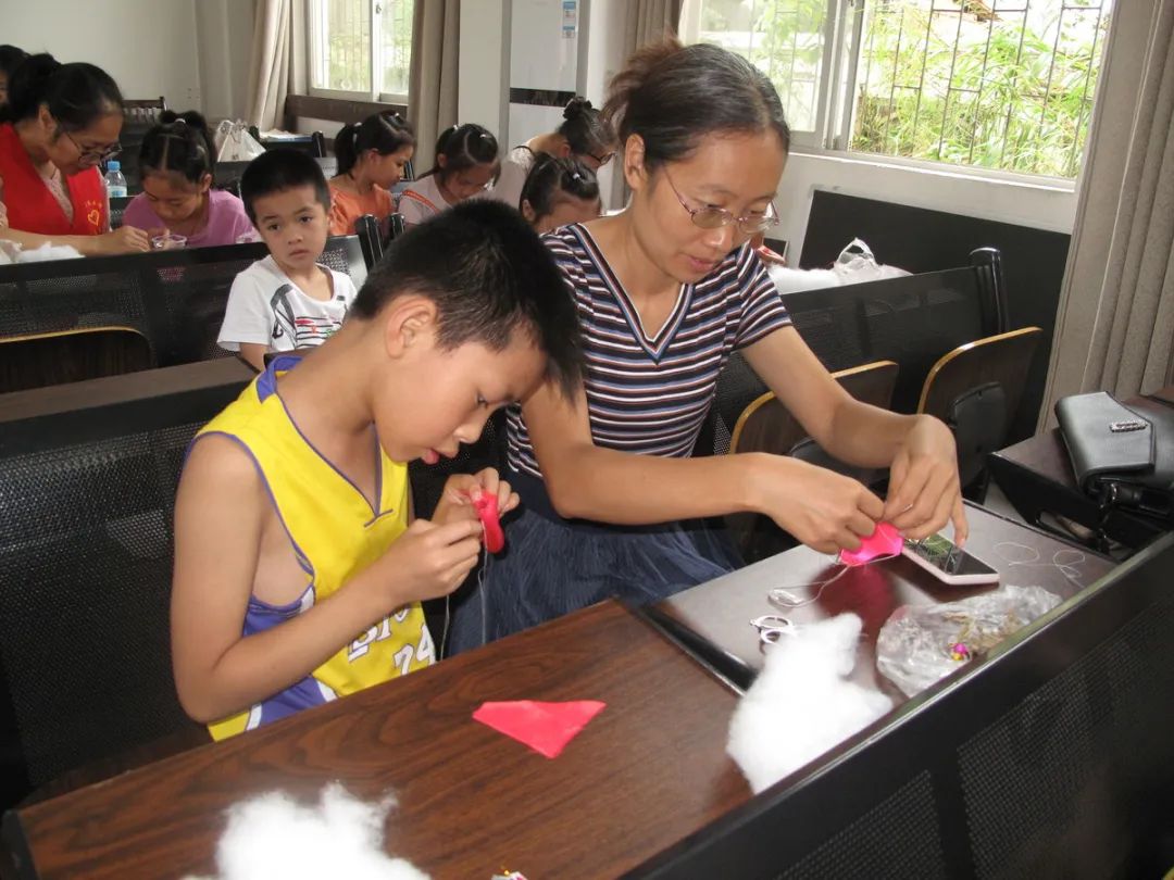 接着张技师介绍工艺品的制作工具、材料、方法。工具主要有剪刀、针线和顶针,所需材料为绸面料、人工绵填充物、珠子、花边、艾草、神砂等,做好的工艺品除了祈福、吉祥如意等的意义,还有防病驱邪安康作用。工序方法上,先选布料熨平、配色、裁剪、锁边、配饰品等做好前期准备工作,之后缝制好工艺品各部位,再拼接成品。指导课中,为便于亲子们理解,技师示范了各部位的半成品,并展示了四只和六只猴抱金瓜的成品,色彩精美搭配与精致的手工艺,亲子们不由发出阵阵赞叹,激起亲子们极大的兴趣,个个都急不可待跃跃欲试。本次活动,鉴于亲子为初学者,县图书馆为亲子们准备了最易于制作的“单猴子抱金瓜”手工材料。因工艺品涉及材料多,工序精细较复杂、存在一定技术性,参加活动亲子初始手足无措,在技师的示范和指导下,亲子们分工协作,一件件精美的工艺品在他们手中诞生,亲子们充满获得感、成就感,兴趣高。活动结束时,县图书馆赠送参加活动的每位小朋友“母背子猴子抱金瓜”一个,引导小朋友爱老孝亲的感恩教育。亲子们纷纷表示,今年过了一个不一样的“端午节”,满意度溢于言表。