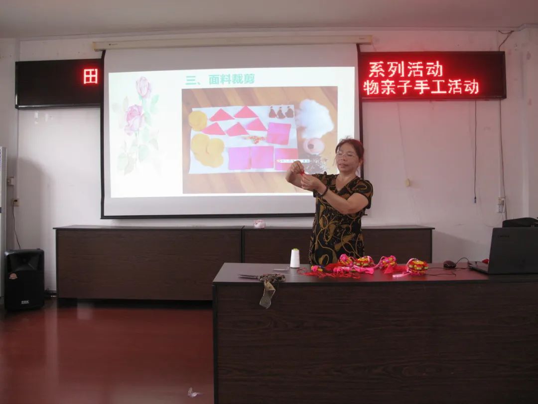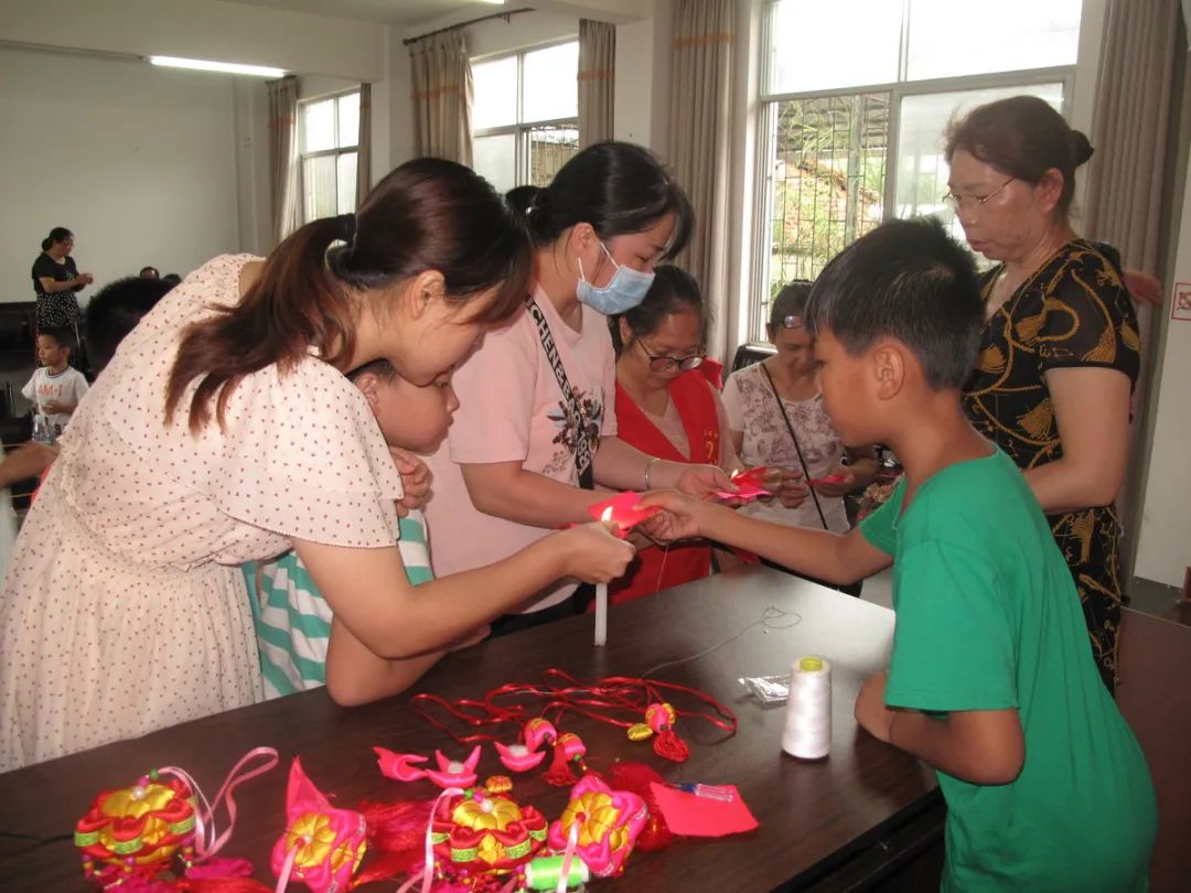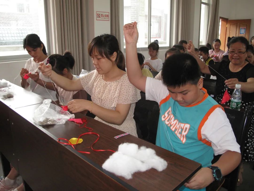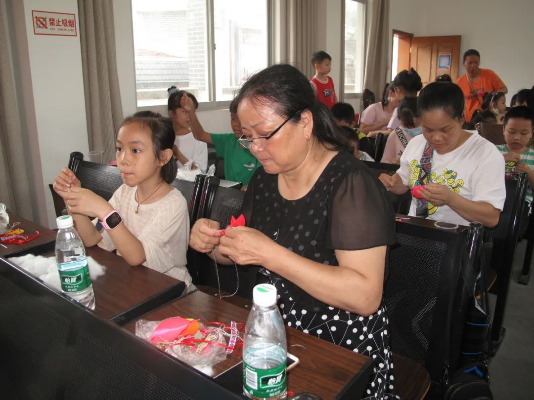 接着张技师介绍工艺品的制作工具、材料、方法。工具主要有剪刀、针线和顶针,所需材料为绸面料、人工绵填充物、珠子、花边、艾草、神砂等,做好的工艺品除了祈福、吉祥如意等的意义,还有防病驱邪安康作用。工序方法上,先选布料熨平、配色、裁剪、锁边、配饰品等做好前期准备工作,之后缝制好工艺品各部位,再拼接成品。指导课中,为便于亲子们理解,技师示范了各部位的半成品,并展示了四只和六只猴抱金瓜的成品,色彩精美搭配与精致的手工艺,亲子们不由发出阵阵赞叹,激起亲子们极大的兴趣,个个都急不可待跃跃欲试。本次活动,鉴于亲子为初学者,县图书馆为亲子们准备了最易于制作的“单猴子抱金瓜”手工材料。因工艺品涉及材料多,工序精细较复杂、存在一定技术性,参加活动亲子初始手足无措,在技师的示范和指导下,亲子们分工协作,一件件精美的工艺品在他们手中诞生,亲子们充满获得感、成就感,兴趣高。活动结束时,县图书馆赠送参加活动的每位小朋友“母背子猴子抱金瓜”一个,引导小朋友爱老孝亲的感恩教育。亲子们纷纷表示,今年过了一个不一样的“端午节”,满意度溢于言表。