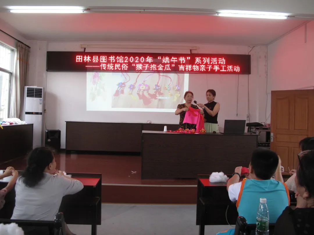 “猴子抱金瓜”是纯手工工艺品,是区域壮汉民族在“端午节”喜欢佩戴的传统吉祥物,它寓意智慧、才能、财富,是人们向往美好生活的意愿。6月20日,值端午节即将到来之际,县图书馆在四楼多功能室举办“端午节”传统吉祥物“猴子抱金瓜”亲子手工活动,共有25对亲子55人参加了活动。