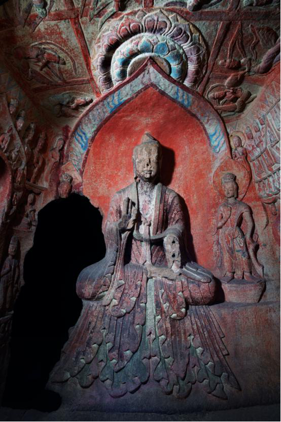 作为云冈最大的平面椭圆形、穹隆顶洞窟,第5窟具有较大的窟内空间。北壁和东西两壁各塑坐佛和立佛大像,形成洞窟三佛主题。北壁为主尊坐佛。南壁围绕窟门和明窗进行两侧对称性雕刻。东西两壁立佛左右和上方,采取分层式布局, 由平行花纹装饰带隔离形成上下约8层龛像,并顺势完成了对南北壁面雕刻的过渡性衔接。