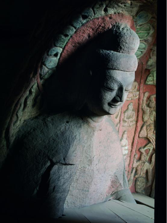 在宽约10米,高约13.1米的面积中,雕刻了一佛二菩萨大型造像。人物肌体造型丰满,塑造的应是“西方三圣”形象,即中央主尊为阿弥陀佛,左侧为观世音菩萨,右侧为大势至菩萨。