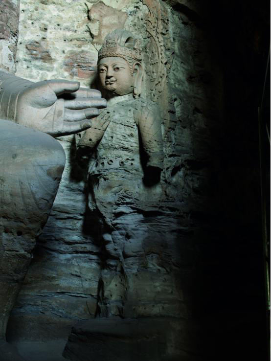 此像应为大势至菩萨, 高约6米,头戴宝瓶宝冠。菩萨身姿挺立,右手抚胸,手背丰满,拇指与食指持供养物,左手臂下垂。此像上半身保存较好,衣纹贴体,但双腿风化严重。可见斜披络腋,阶梯式衣纹轻薄贴体,小腹微凸,下身着裙,脚踏莲座。