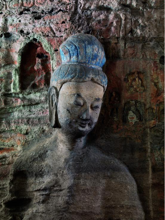 此像应为观世音菩萨,高约6米,头戴兽面宝冠,辫发丝丝分明,面相圆润饱满,五官清晰秀丽。菩萨身姿挺立,左手臂下垂,屈右手臂抚胸。身体上下均风化严重。但可见其为袒上身,斜披络腋,阶梯式衣纹轻薄贴体,小腹微凸、下身着裙、脚踏莲座。