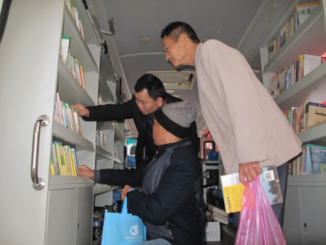图为 旧州镇种养植户在流动图书车里挑选科技书