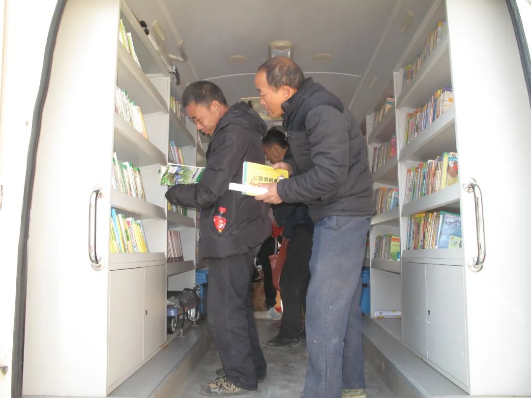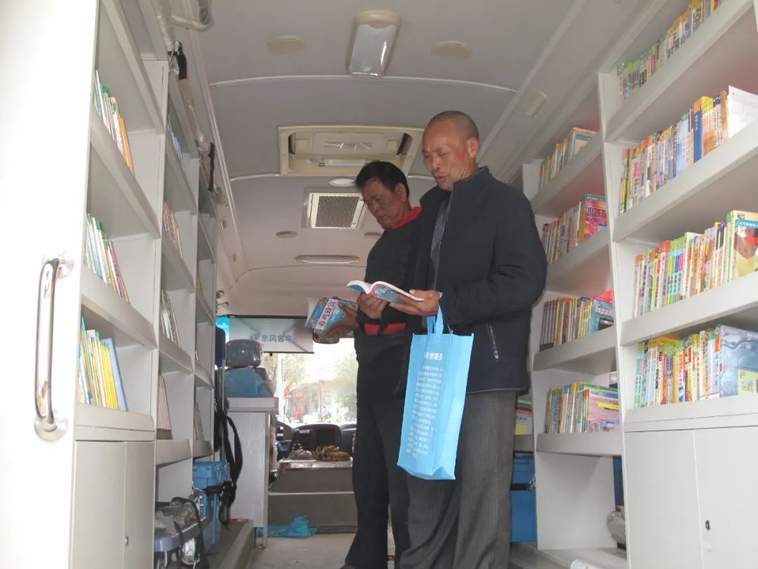 图为 利周乡种养植户在流动图书车里挑选科技书