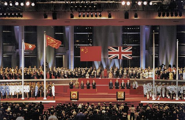 1997年6月30日午夜至7月1日凌晨,中英两国政府香港政权交接仪式在香港会议展览中心新翼五楼大会堂隆重举行。此刻中国国旗在升起,英国国旗在降落。