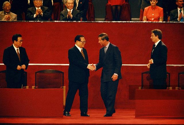 1997年7月1日,中英香港交接典礼上,中英两国领导人走到主席台前,中方国家主席江泽民与英方查尔斯王子握手合影。