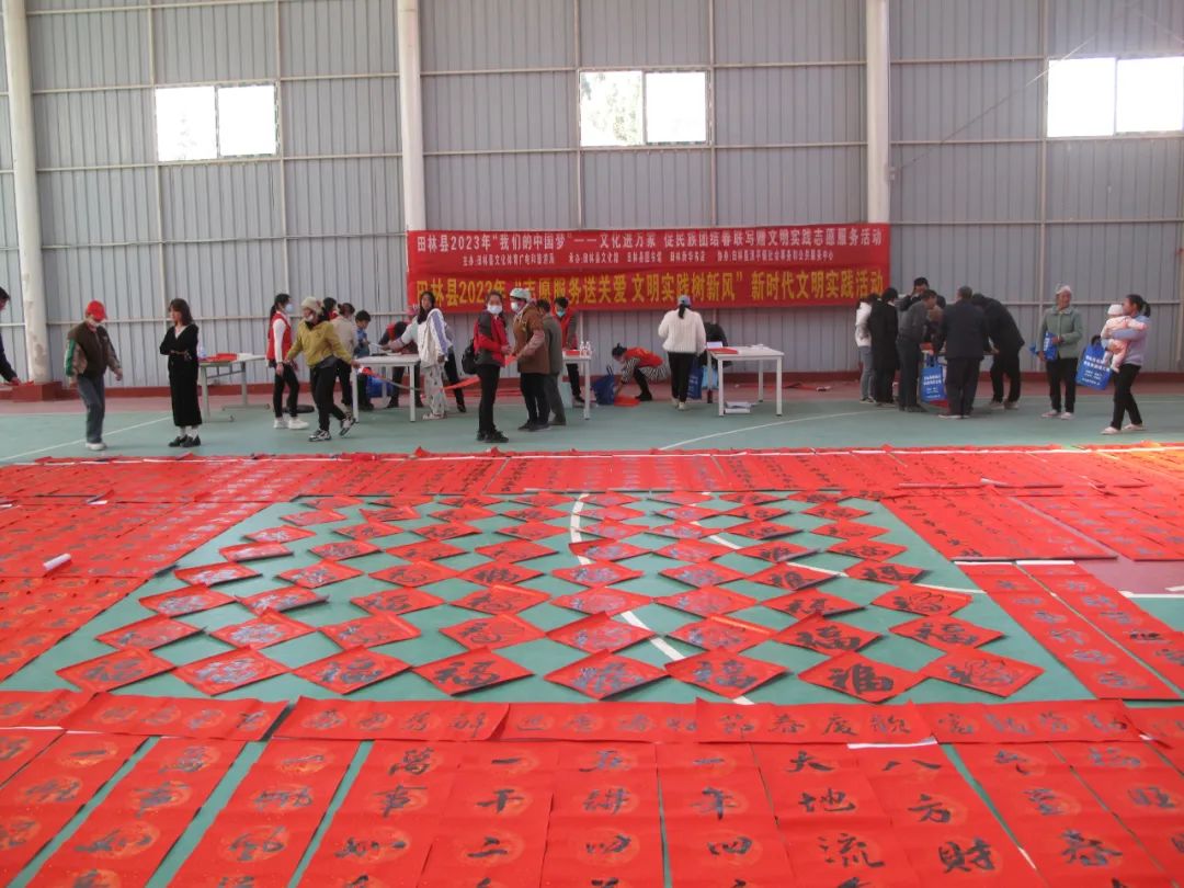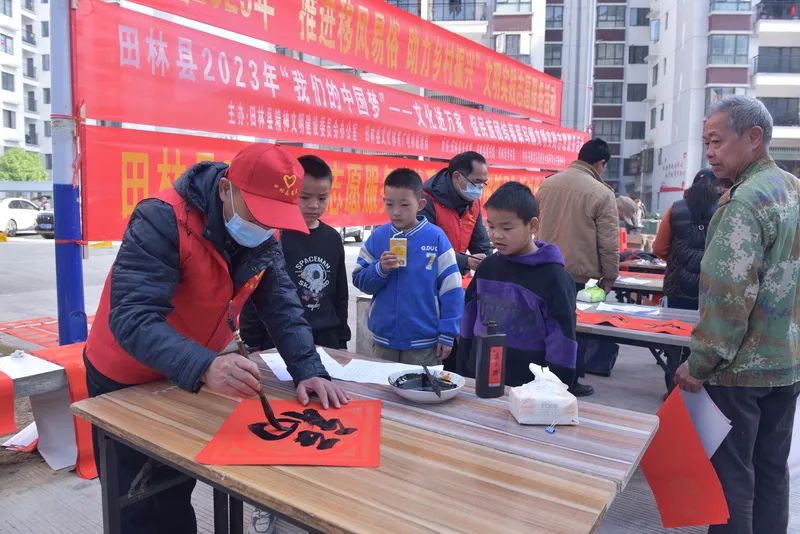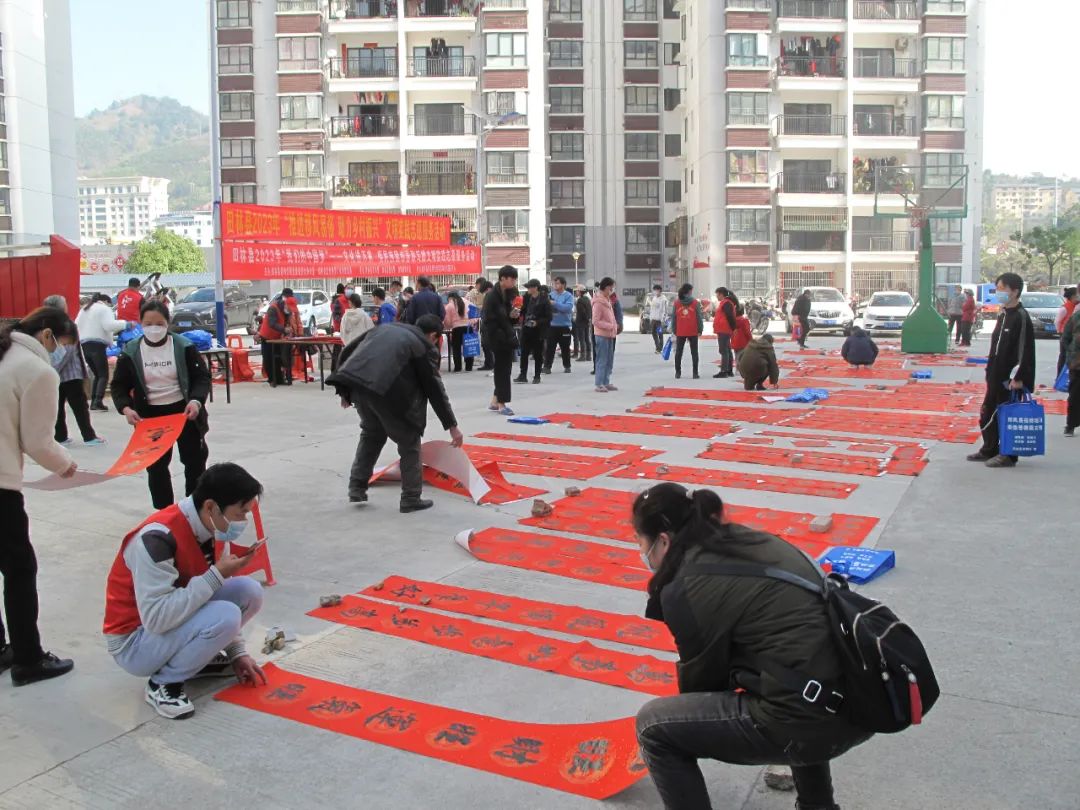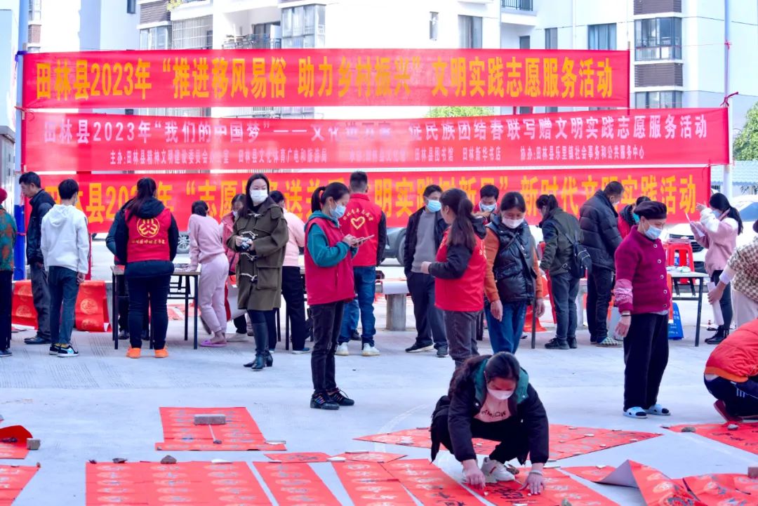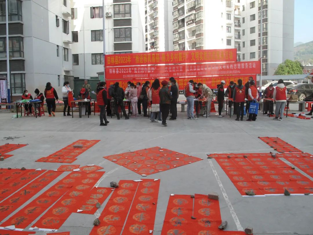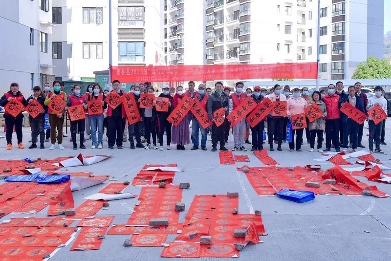 千门万户曈曈日,总把新桃换旧符。贴对联,是中华民族春节祈福迎祥的传统文化,是人们寄语未来美好的愿景,既弘扬中国民族优秀传统文化,又营造积极向上的春节氛围。2023年元月12-13日,由田林县精神文明建设委员会办公室、县文旅游局主办,县文化馆、图书馆、田林新华书店承办的“田林县2023年‘我们的中国梦’——文化进万家 促民族团结春联写赠文明实践志愿服务活动”,分别在浪平镇老乡家园—田林县易地扶贫搬迁项目浪平安置点、镇里镇乐安社区等地开展。