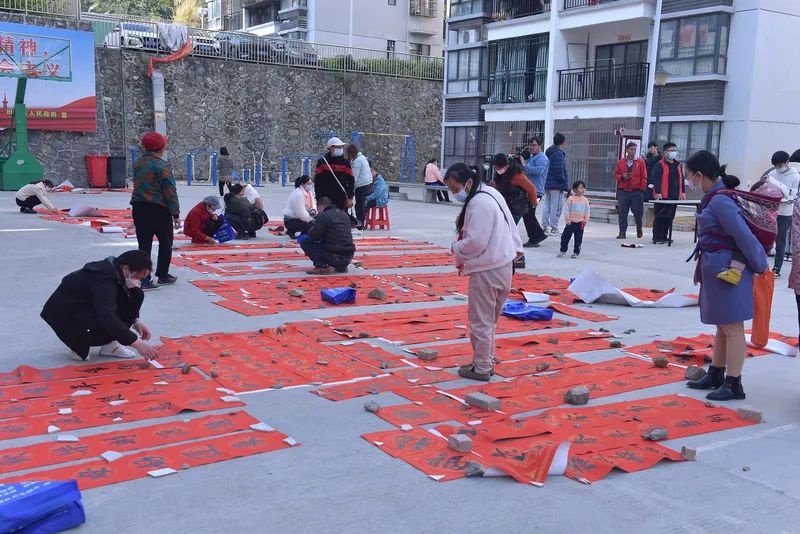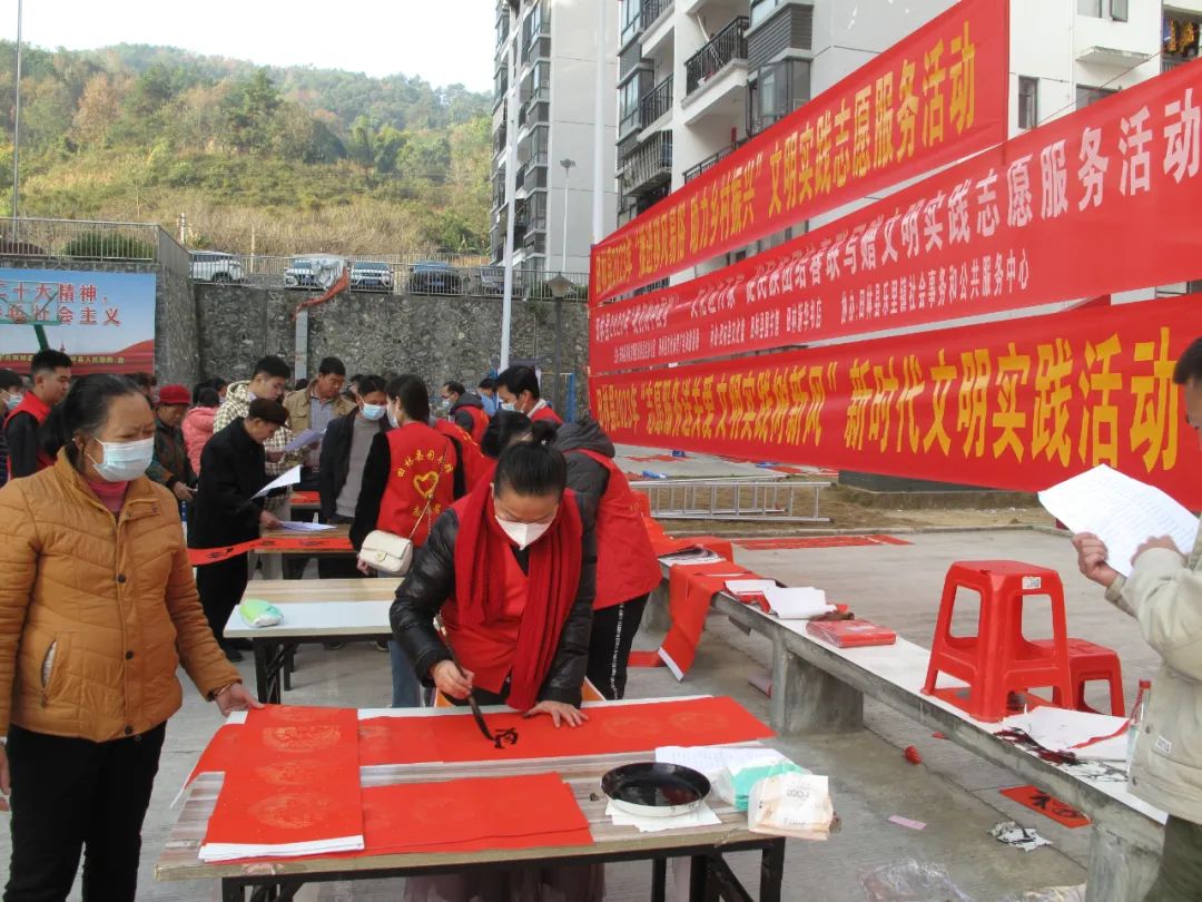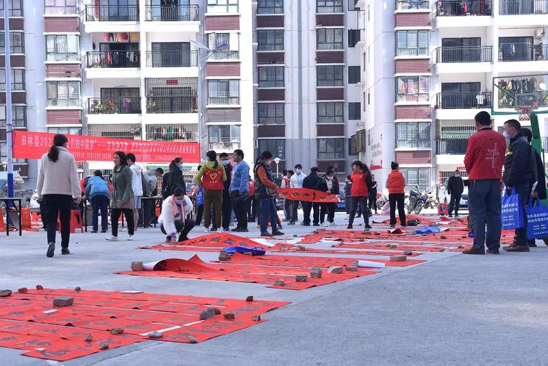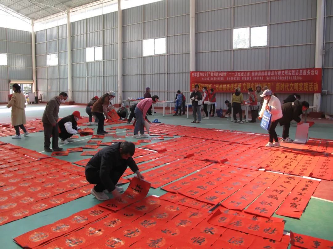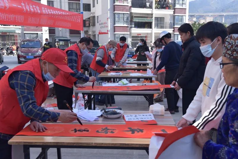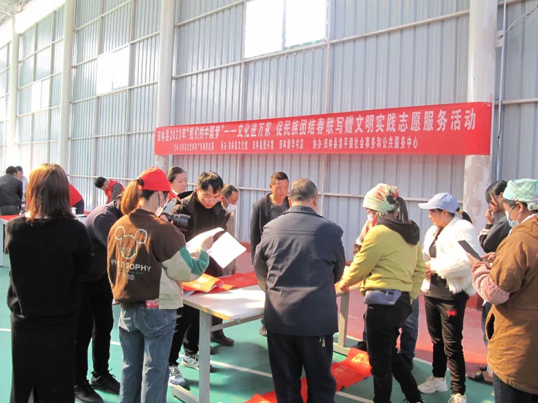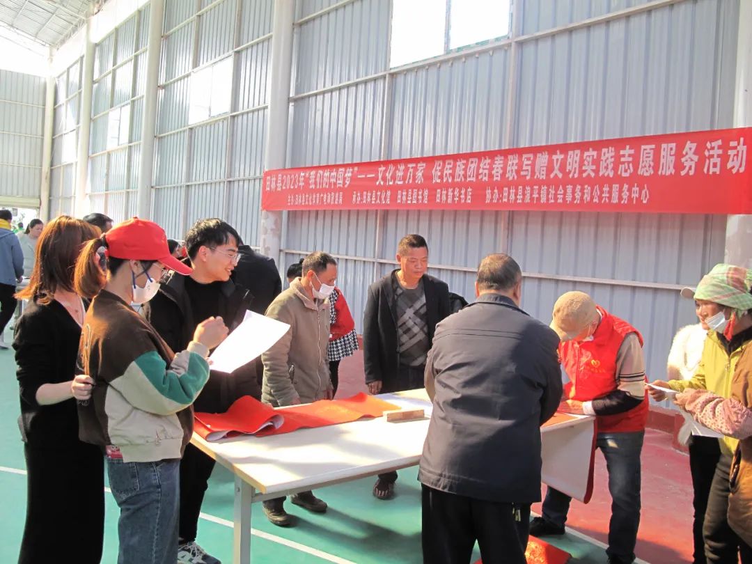 千门万户曈曈日,总把新桃换旧符。贴对联,是中华民族春节祈福迎祥的传统文化,是人们寄语未来美好的愿景,既弘扬中国民族优秀传统文化,又营造积极向上的春节氛围。2023年元月12-13日,由田林县精神文明建设委员会办公室、县文旅游局主办,县文化馆、图书馆、田林新华书店承办的“田林县2023年‘我们的中国梦’——文化进万家 促民族团结春联写赠文明实践志愿服务活动”,分别在浪平镇老乡家园—田林县易地扶贫搬迁项目浪平安置点、镇里镇乐安社区等地开展。