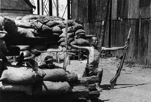 ▲在与日军的对峙中,一名29军战士在阵前摆出蔑视敌人的姿势。
