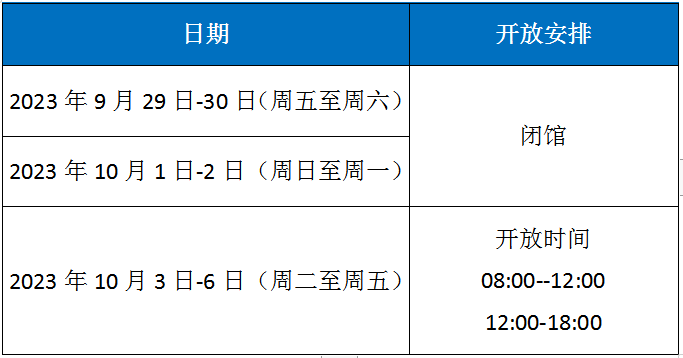 根据国务院办公厅《关于2023年部分节假日安排的通知》精神,我馆中秋、国庆节期间开放时间安排如下: