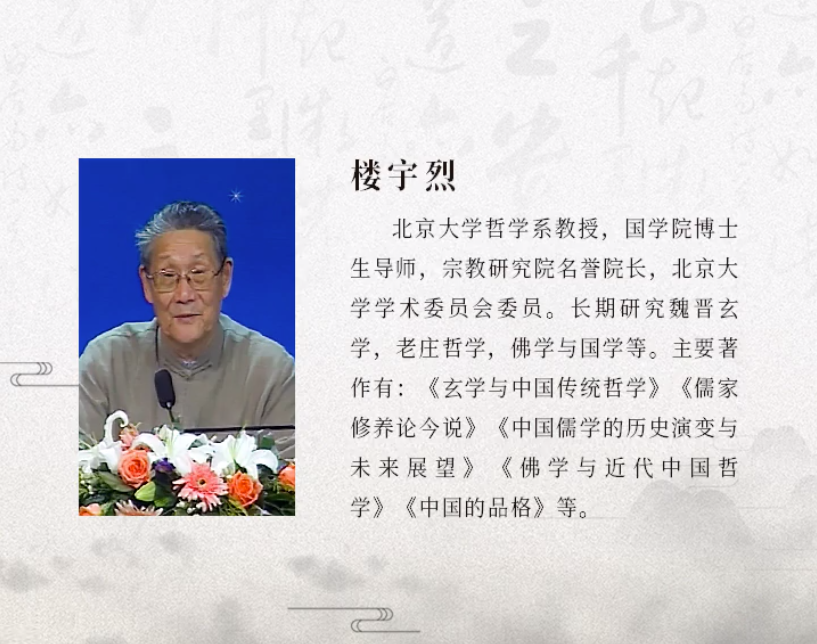楼宇烈,男,北京大学哲学系教授,国学院博士生导师,宗教研究院名誉院长,北京大学学术委员会委员。兼任教育部人文社会科学研究专家咨询委员会委员,全国古籍整理出版规划领导小组成员,中国社会科学院东方文化研究中心特约研究员,中国社会科学院佛教研究中心特约研究员。长期研究魏晋玄学、老庄哲学、佛学与国学等。主要论著有:《玄学与中国传统哲学》《儒家修养论今说》《中国儒学的历史演变与未来展望》《佛学与近代中国哲学》《中国的品格》等。他是中国文化最真诚的倡导者、实践者,亦是研究当代国学的中流砥柱。