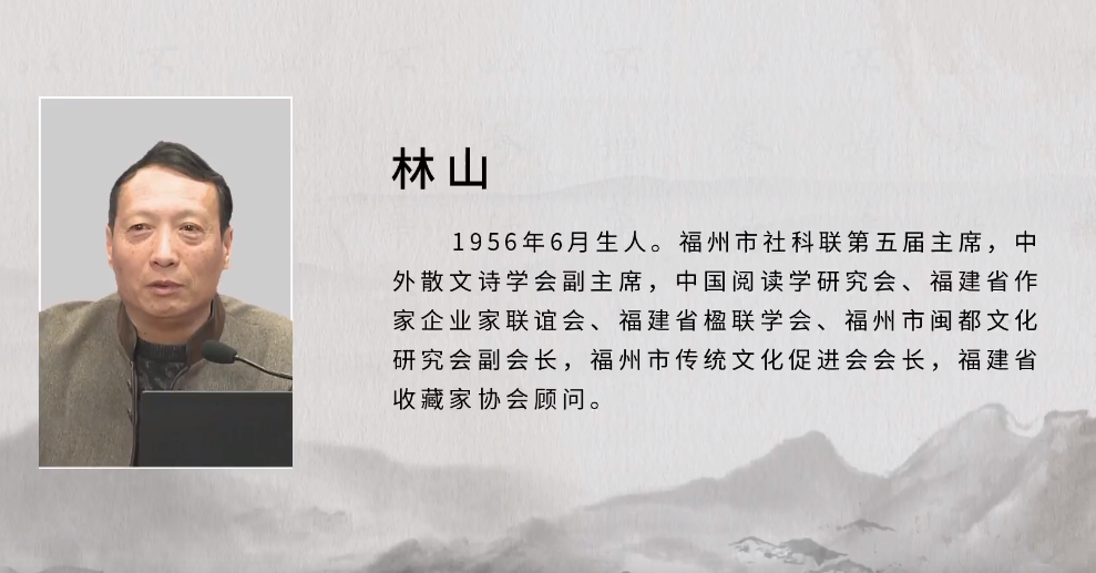 林山,男,福州市社会科学界联合会主席。中外散文诗学会副主席,中国阅读学研究会、福建省楹联学会、福州市闽都文化研究会副会长,省作家协会会员,市传统文化促进会会长。著有《书的放生》,编著《联话福州》、《山水福州》,主编《福州十大名片》、《闽都文化概论》等书籍。