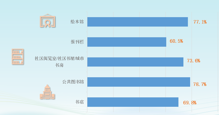 在使用过以上公共阅读服务设施的城镇成年居民中,公共图书馆的使用满意度最高,为78.7%;绘本馆的使用满意度为77.1%;社区阅览室/社区书屋/城市书房的使用满意度为73.6%;书店的使用满意度为69.8%;报刊栏的使用满意度为60.5%。