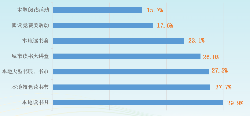 (六)各地全民阅读品牌活动影响力进一步扩大,居民参与度和满意度持续攀升2023年,我国成年国民对全民阅读品牌活动的知晓率达74.1%,较2022年的73.7%增长了0.4个百分点。其中,“本地读书月”的影响力最大,选择比例近三成(29.9%);“本地特色读书节(如大学生读书节、机关读书节等)”“本地大型书展、书市活动”“城市读书大讲堂”的选择比例相对较高,分别为27.7%、27.5%和26.0%;“本地读书会”的选择比例为23.1%;“阅读竞赛类活动”和“主题阅读活动(如红色主题阅读、‘学习强国’应用推广等)”的选择比例分别为17.6%和15.7%。