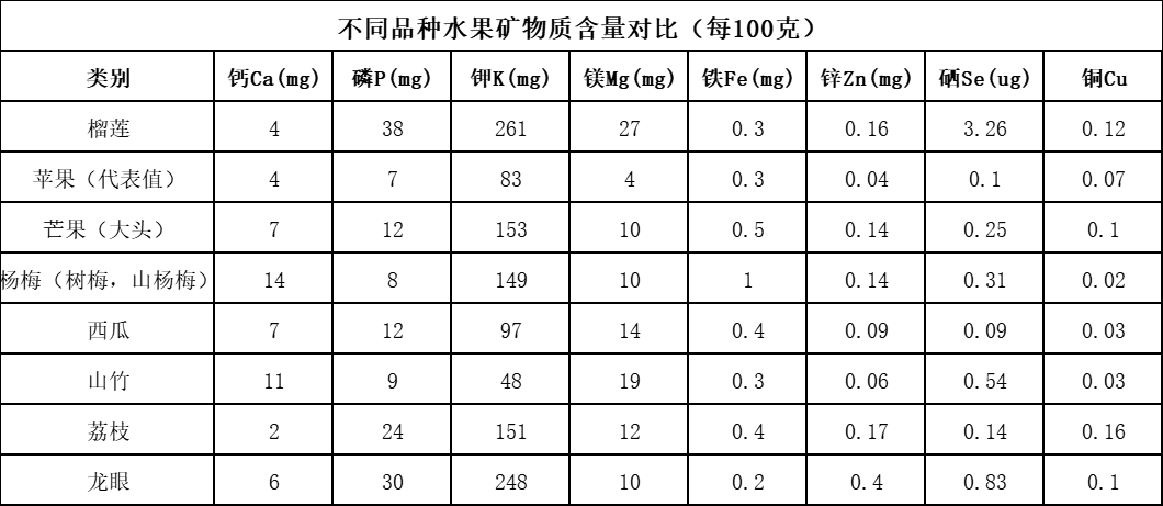 提示:比较发现,榴莲的磷、钾、镁、硒、铜含量均排第一,在矿物质含量方面,榴莲有较好的营养优势。