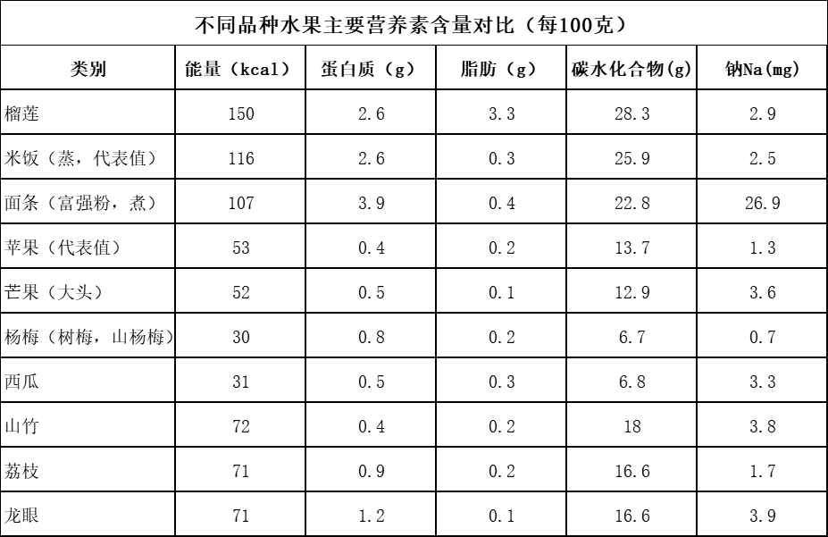 为了增加对比的直观性,小编以榴莲作为参照,将米饭、面条与夏季常见的水果放在一起进行对比。从下表可见,每100克榴莲的能量最高,高于米饭和面条,是其他常见水果的3-5倍;蛋白质含量为与米饭、面条相差不大,但远高于其他常见水果;脂肪含量远高于米饭、面条及其他水果;碳水化合物与米饭、面条相差不大,高于其他水果,钠含量与其他水果相差不大。