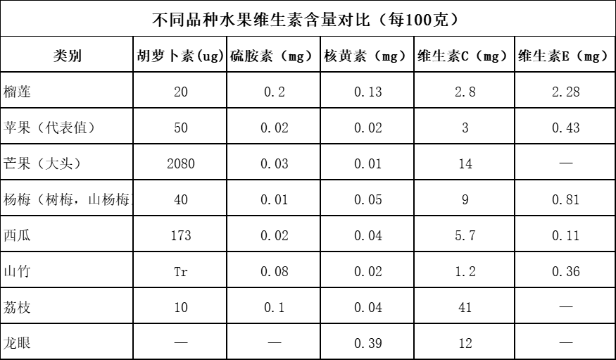 维生素含量相比较,榴莲的胡萝卜素含量低于其他水果;各类水果维生素B1含量相差不大;维生素B2含量相差不大;维生素C含量荔枝、龙眼、芒果含量较高,与其他水果相差不大;维生素E含量高于其他水果。