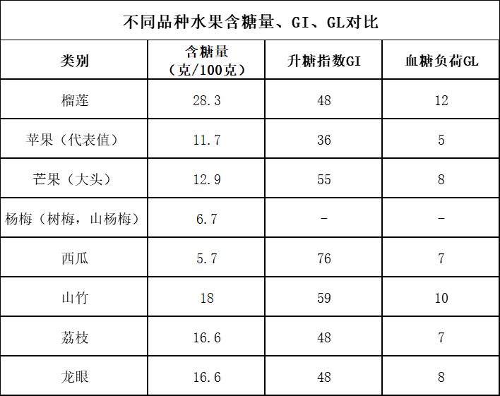 比较可知,榴莲的含糖量最高,其次是荔枝和龙眼,西瓜的升糖指数最高,榴莲的升糖指数与其他水果相差不大;榴莲的血糖负荷最高,其次是山竹。