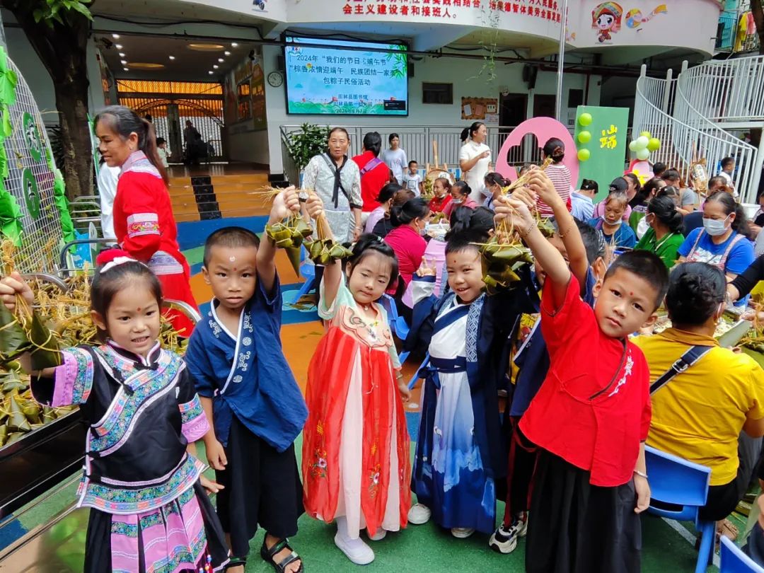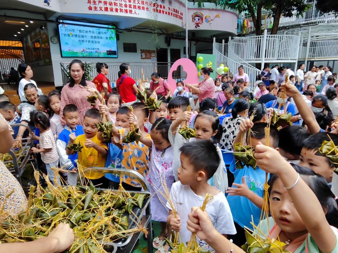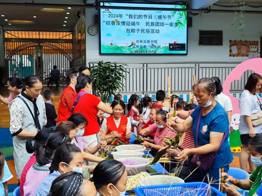 6月7日上午,各民族的亲子们欢聚一堂在田林县第县一幼儿园开展迎“我们的节日·端午节”系列民俗活动。活动由县一幼和图书馆联合开展,以“粽香情浓迎端午 民族团结一家亲”为主题,幼儿及家长近500人参加活动。