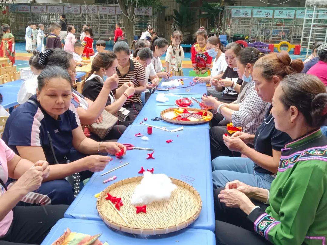 同样,佩戴麽乜和香包也是端午节必不可少的一种习俗。麽乜和香包由人工绵填充物、珠子、花边、艾草、神砂等组成,具有祈福、吉祥如意等的意义,还有防病驱邪安康作用。活动中,家长们色彩精美搭配、飞针走线,填充物……不一会,一个个精美的工艺品在他们手中诞生,寓意各民族群众向往“真、善、美”安居乐业、幸福生活。