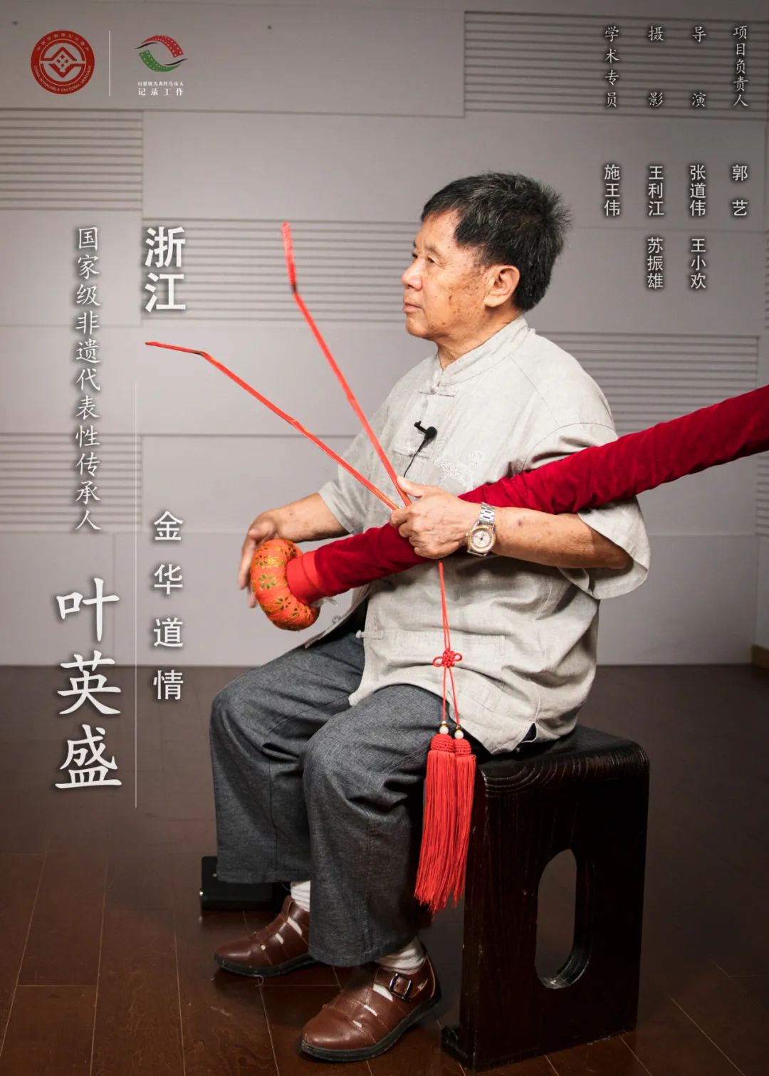 叶英盛,1947年出生,男,汉族,浙江义乌人,第三批国家级非物质文化遗产代表性传承人。金华道情也称“道歌”,发源于义乌市,原为在道观内演唱的诗赞体“经韵”,后吸收其他词调和曲牌音乐,演变为在民间布道时演唱的“新经韵”。金华道情用金华方言单口坐唱,有连白带唱、唱中插白和间插平板几种方式。其音调多采用徵调式,结构完整,节奏多样,以金竹所制的情筒(又称“渔鼓”)和两块竹片组成的简板伴奏,现存传统曲目425部,内容涉及金华及周边地区300多年来社会、政治、经济及民俗等方面的演变。叶英盛11岁开始学艺,把义乌道情单一的说唱形式发展为说、唱、演相互融合的曲艺形式,丰富了道情的表现力,使之能更生动地反映生活。