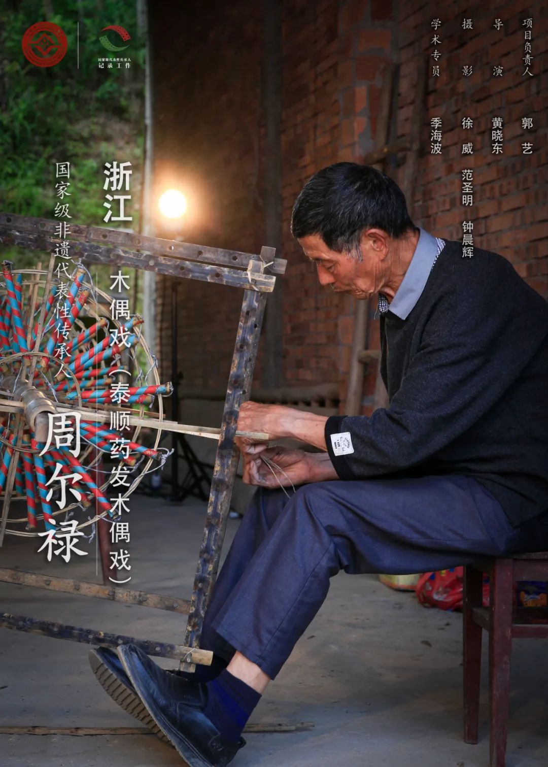 周尔禄,1945年出生,男,汉族,浙江泰顺人,第二批国家级非物质文化遗产代表性传承人。木偶戏古称“傀儡戏”“傀儡子”,是由艺人操作木偶表演故事的一种传统戏曲形式。泰顺药发木偶戏是将烟花与木偶相结合,在泰顺称为“琼花木偶”。泰顺药发木偶已有300多年历史,其表演分为盘式和树式两种形式,主要用于庙会、祭祀、节日等民俗活动。表演时,在烟花的带动下,木偶凌空飞舞、五彩纷呈、栩栩如生。药发木偶的制作包括原材料选备、火药配比、木偶制作等环节。周尔禄是泰顺县大安周氏药发木偶第十代传人,13岁跟随父亲周明守学习药发木偶的制作,18岁出师,与药发木偶戏相伴60余年。周尔禄精通控制火药的技术,逢年过节受邀至各地制作和表演药发木偶戏,使工艺复杂、精细的药发木偶得以传播和传承。