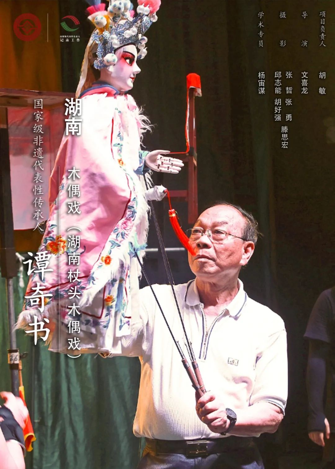 谭奇书,1941年生,男,汉族,湖南祁阳人,第五批国家级非物质文化遗产代表性传承人。湖南杖头木偶戏起源于湘南、湘西一带的杖头“内扦子”木偶,是极具地域艺术特色的“三大”杖头木偶戏之一,有800余年的历史。湖南杖头木偶戏以传统剧目著称,老一辈艺人擅长演出《拦马》《鸿门宴》《芦花荡》《盗仙草》《目莲戏》等短小精悍的折子戏。谭奇书师承湖南杖头木偶戏艺术大师李海轩,15岁创作第一部大型杖头木偶神话“台上台”剧《金鳞记》,16岁进入湖南省木偶皮影艺术剧院工作,系统掌握杖头木偶戏制作、操作以及表演艺术,有着较高的编剧、导演水平,曾获国内外多个奖项,代表作品有《金鳞记》《孙悟空三打白骨精》《智取威虎山》《化蝶》《打面缸》等。