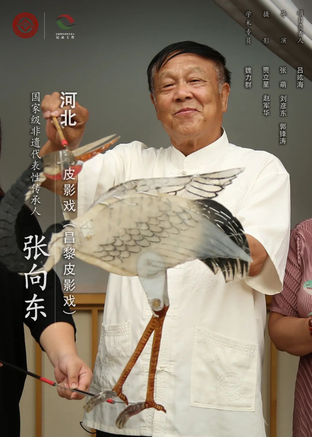 张向东,1947年出生,男,汉族,河北抚宁人,第四批国家级非物质文化遗产代表性传承人。皮影戏是一种以灯光照射和人物剪影表演历史故事与民间传说的民间戏剧,昌黎皮影戏主要流传于河北省秦皇岛市昌黎县及邻近地区。昌黎皮影戏以昌黎民歌为素材,唱腔丰富多彩,乐器以四胡为主,伴以鼓、板、锣等打击乐器。传统剧目有《乾坤带》《秦香莲》《邵玉兰》等。张向东13岁考入唐山市皮影剧院,跟随演唱名家厉景阳、皮影操杆大师齐永衡学艺。作为“拿影”(操杆手)演员,他15岁便被称为“小箭杆王”。张向东在表演上坚持精益求精的态度,常为一句唱腔、一个动作反复斟酌。他收集了6000余件皮影作品,创作了《花木兰》《大闹天宫》《愚公移山》等20余部皮影戏剧目,整理了1000余本皮影影卷,并在保持皮影戏传统风貌的基础上,对部分皮影影卷进行创新和改编。