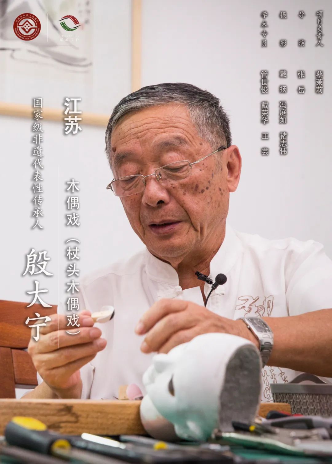 殷大宁,1945年出生,男,江苏泰兴人,第三批国家级非物质文化遗产代表性传承人。扬州的杖头木偶与泉州的提线木偶、漳州的布袋木偶齐名,是中国木偶三大流派之一。托举木偶的“托举功”、操纵木偶的“扦子功”及体现人物步伐特征的“台步功”是杖头木偶的三大基本功。要使木偶真正活起来,必须有木偶制作人员设计制作出活灵活现的木偶人物形象。杖头木偶戏的传统剧目多移植自京剧,同时随着时代的发展不断创新。殷大宁于1961年进入泰兴县木偶剧团,师从贾小奎学习木偶制作技艺,后师从上海美术电影制片厂虞哲光等学习木偶造型相关技艺,为剧团近20台木偶戏担任造型设计和制作,代表作品有《追鱼》《猪八戒找钥匙》《七品芝麻官》《琼花仙子》《三打白骨精》等。