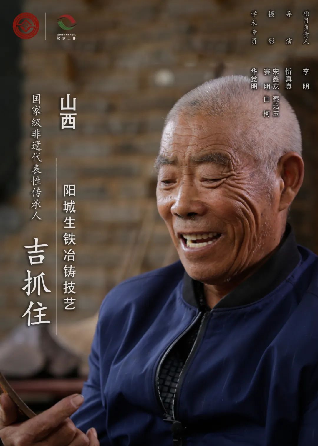 吉抓住,1946年出生,男,汉族,山西阳城人,第一批国家级非物质文化遗产代表性传承人。山西阳城为中国生铁冶铸术的重要留存地,犁炉炼铁和犁镜的铁范铸造等技艺十分突出。该技艺有一整套成熟的工艺,师傅们凭借多年经验,娴熟地掌握炉况、火候及铁水成色,能恰到好处地把握铁水的化学成分和温度。吉抓住1964年开始在犁炉社打杂、看护机器,随舅父张锁明学习冶铸技艺,1976年正式成为犁炉工人,1977年先后在红炉、马甲等地任炉头,直至1984年犁炉停产。多年的经验累积,使他仅靠双眼便可识别火候、水色,被称为“一眼准”。他在传统冶铸工艺的基础上不断改进工艺,尤其是在炉膛的改进上卓有成效。
