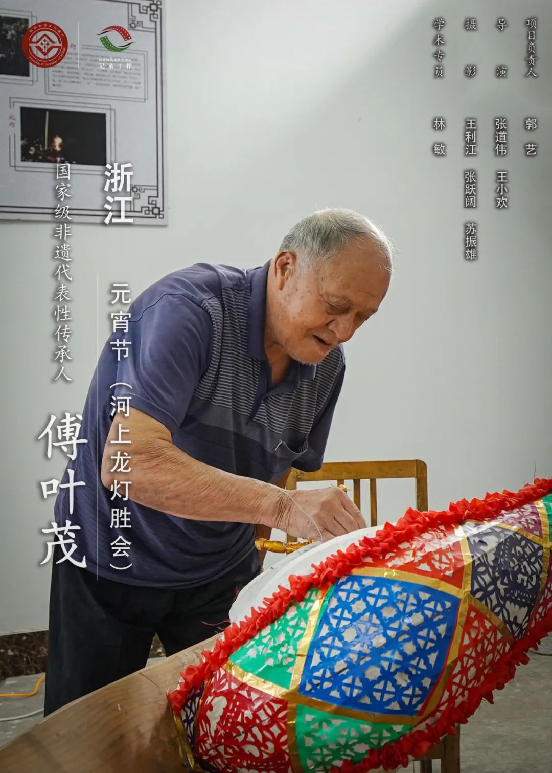 傅叶茂,1937年出生,男,汉族,浙江萧山人,第五批国家级非物质文化遗产代表性传承人。河上龙灯胜会是杭州市萧山区的地方传统民俗,包括开光大典、出灯、闹元宵、化灯四个过程。村民们通过正月十二“起灯日”起引龙灯、正月十五元宵节舞龙、正月十七“化灯日”火化龙身等一系列活动,祈求全年风调雨顺。板龙是河上龙灯胜会的核心。板龙就是接板成龙,将灯板两头打孔,衔接前后龙段,再用木棍穿过固定,使之连成一条波浪形长龙。整个制作纯靠手工,使用竹子、彩纸、糨糊等材料,工艺十分讲究。傅叶茂是板龙龙头制作的核心人物,他向老艺人潜心讨教,又自学刻纸,精通扎龙技艺与龙头装饰,其以凿花为代表的手工技艺成为制作板龙的独门绝技。
