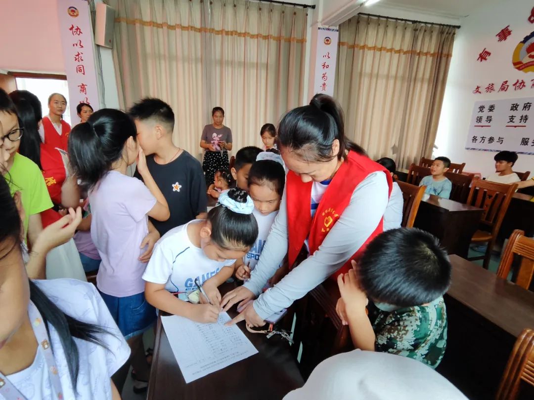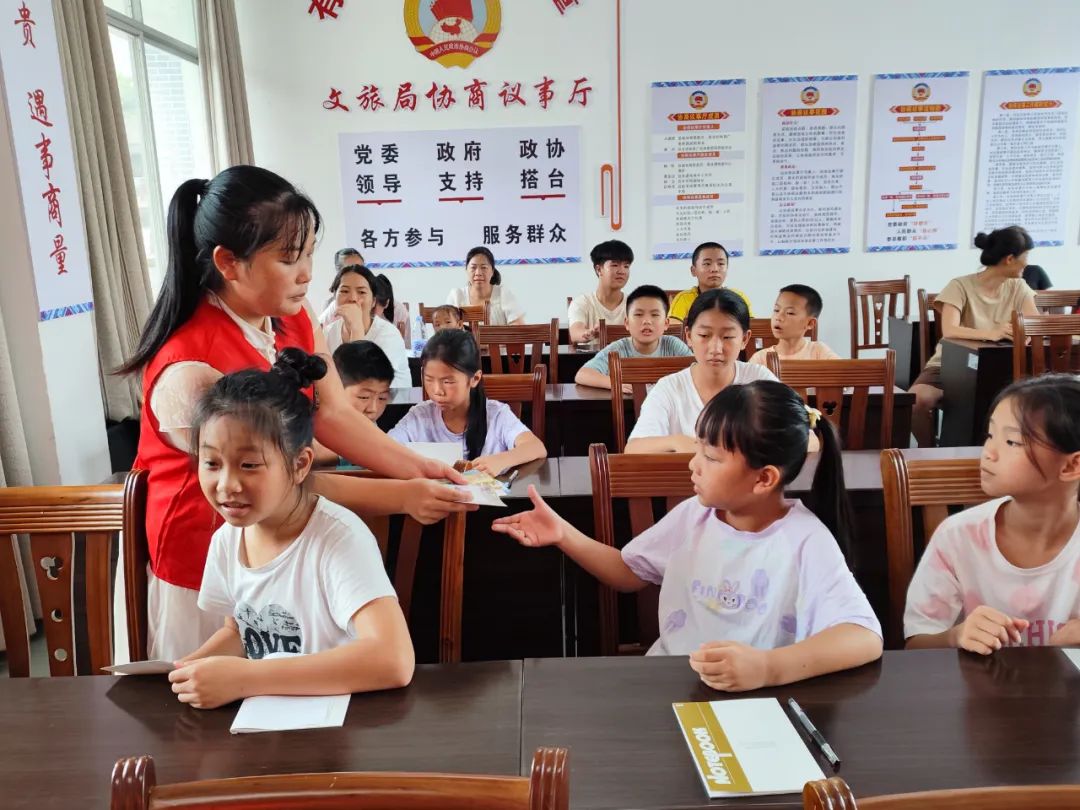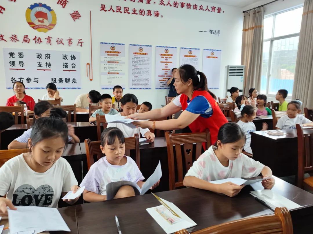 图为志愿者给小朋友发放学习用具