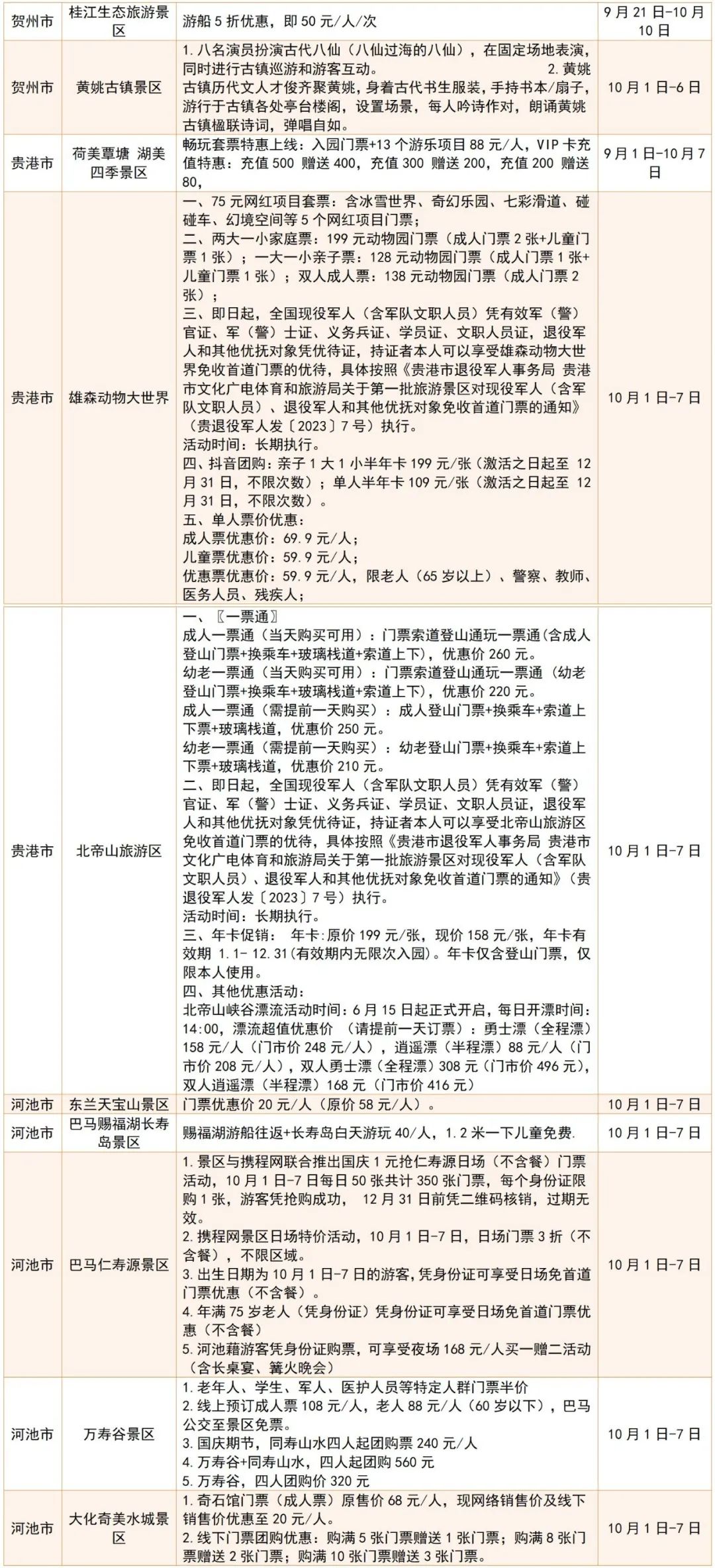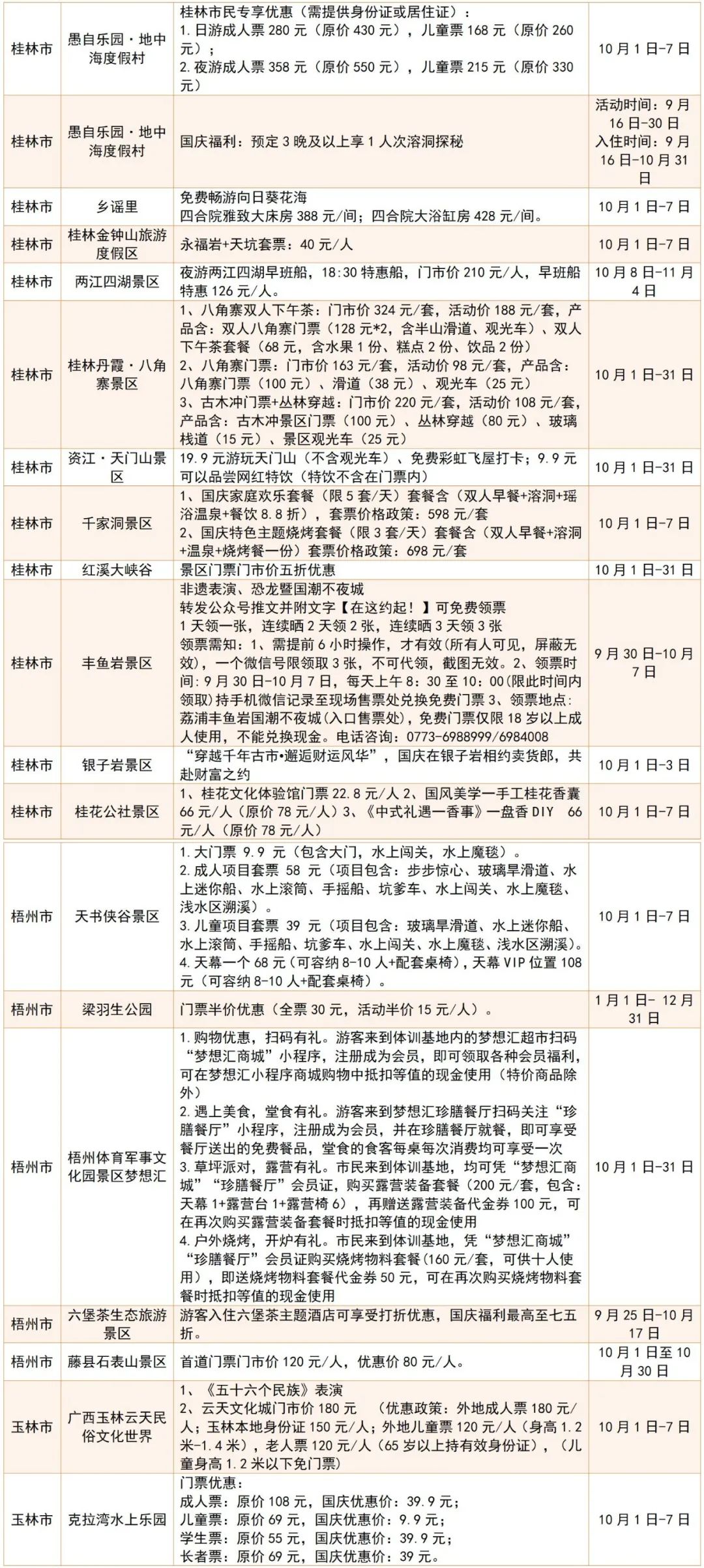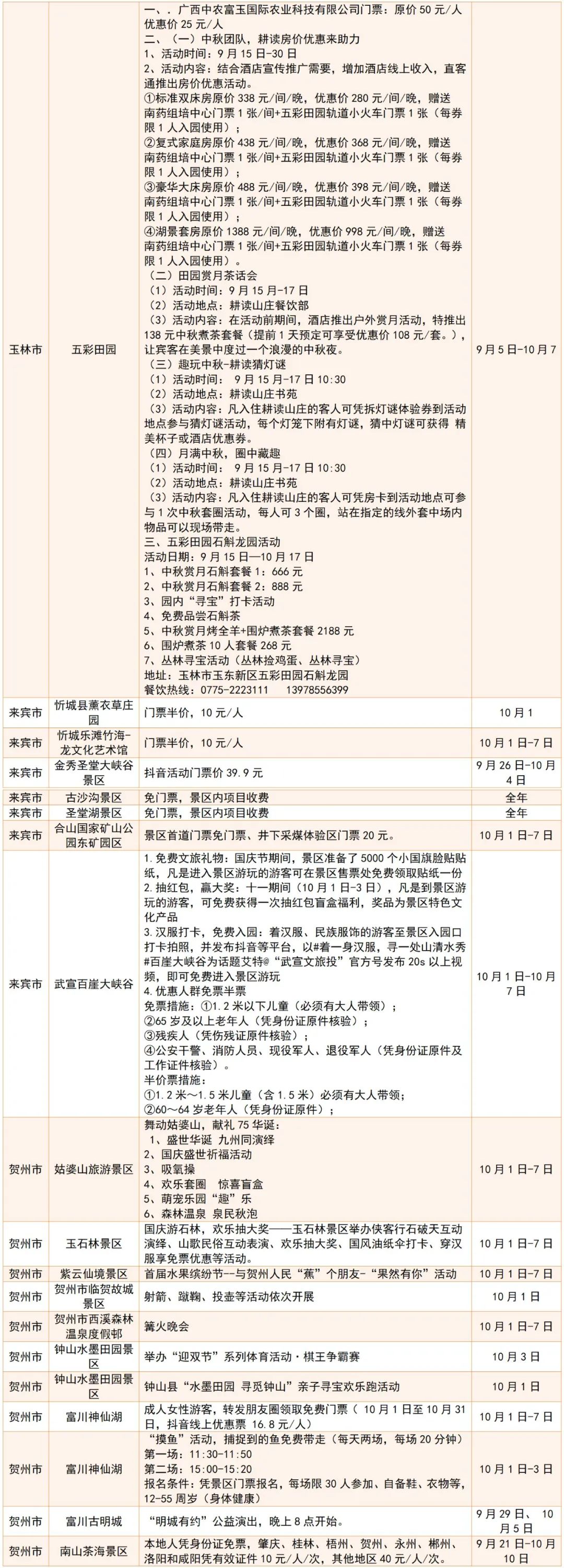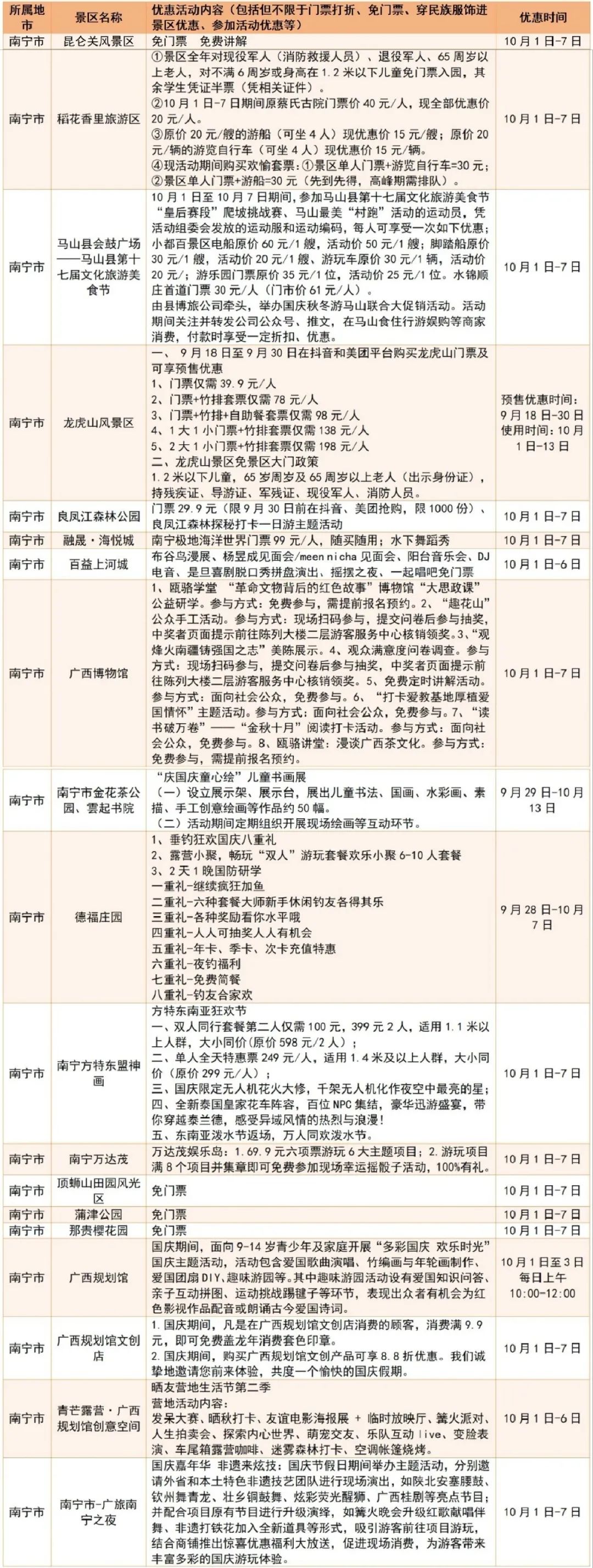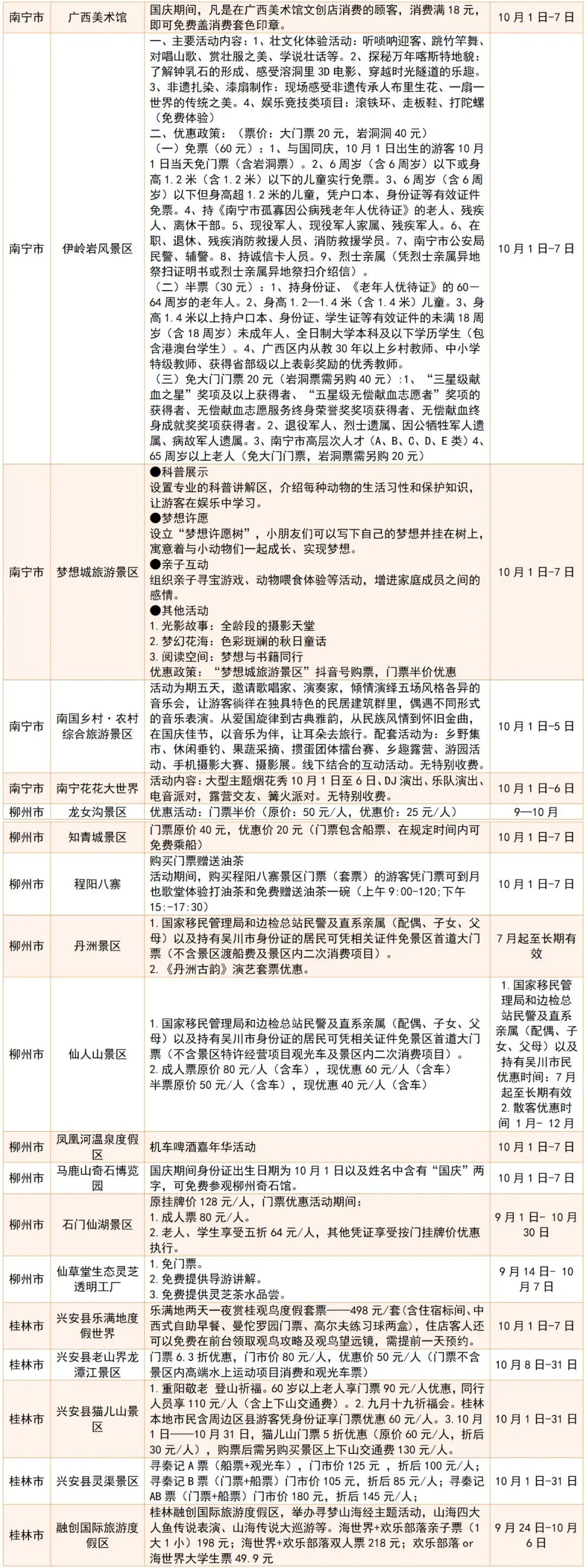 广西国庆假期景区优惠活动统计表