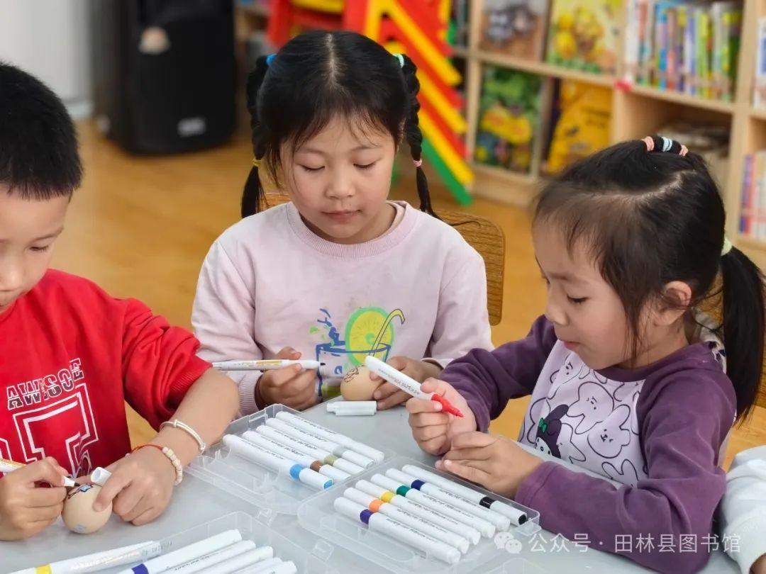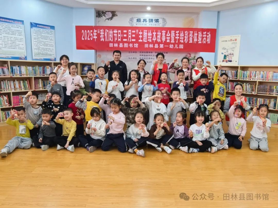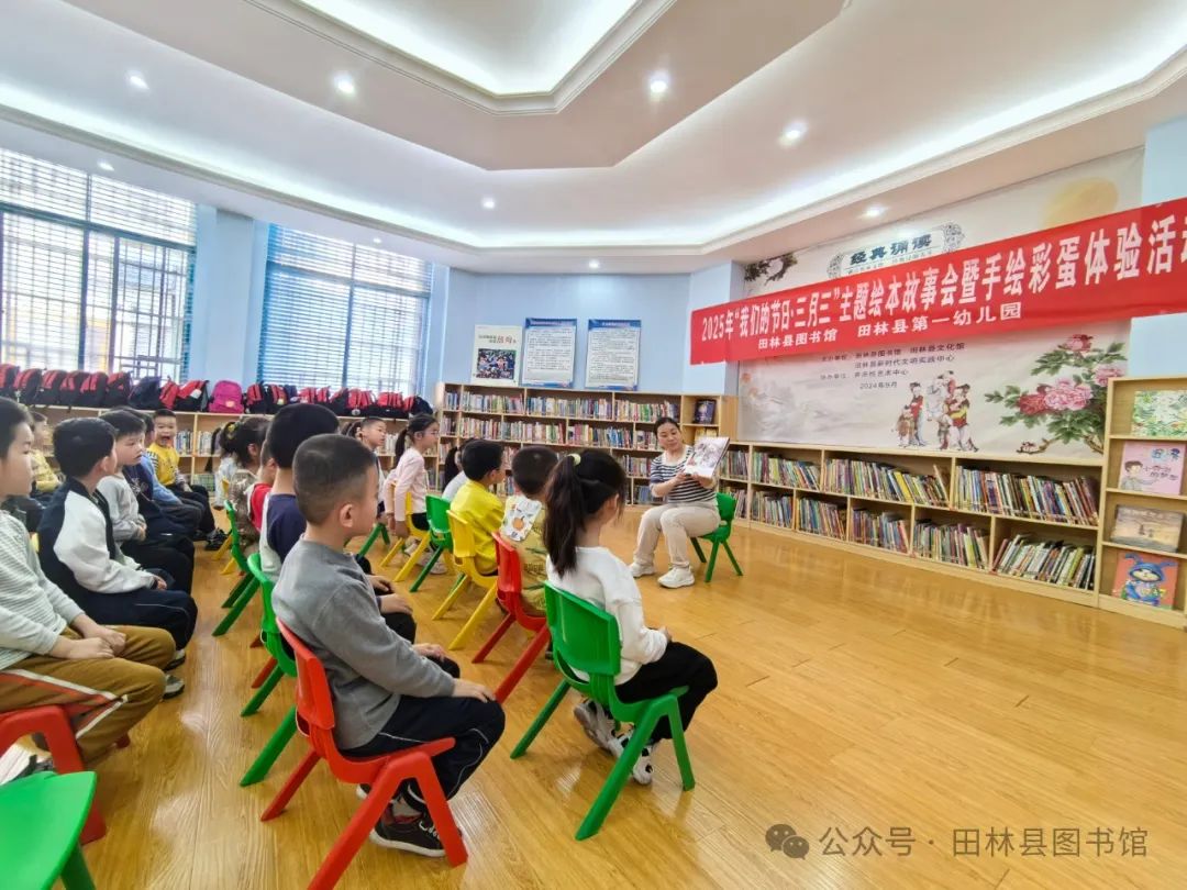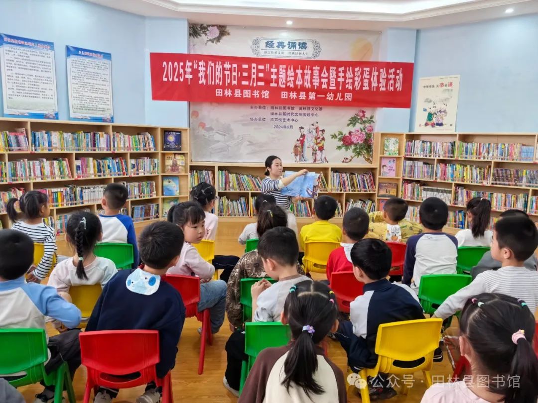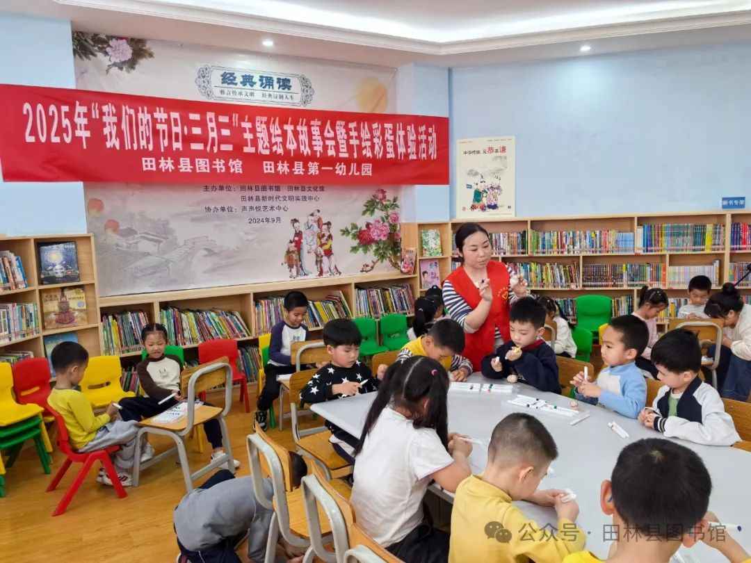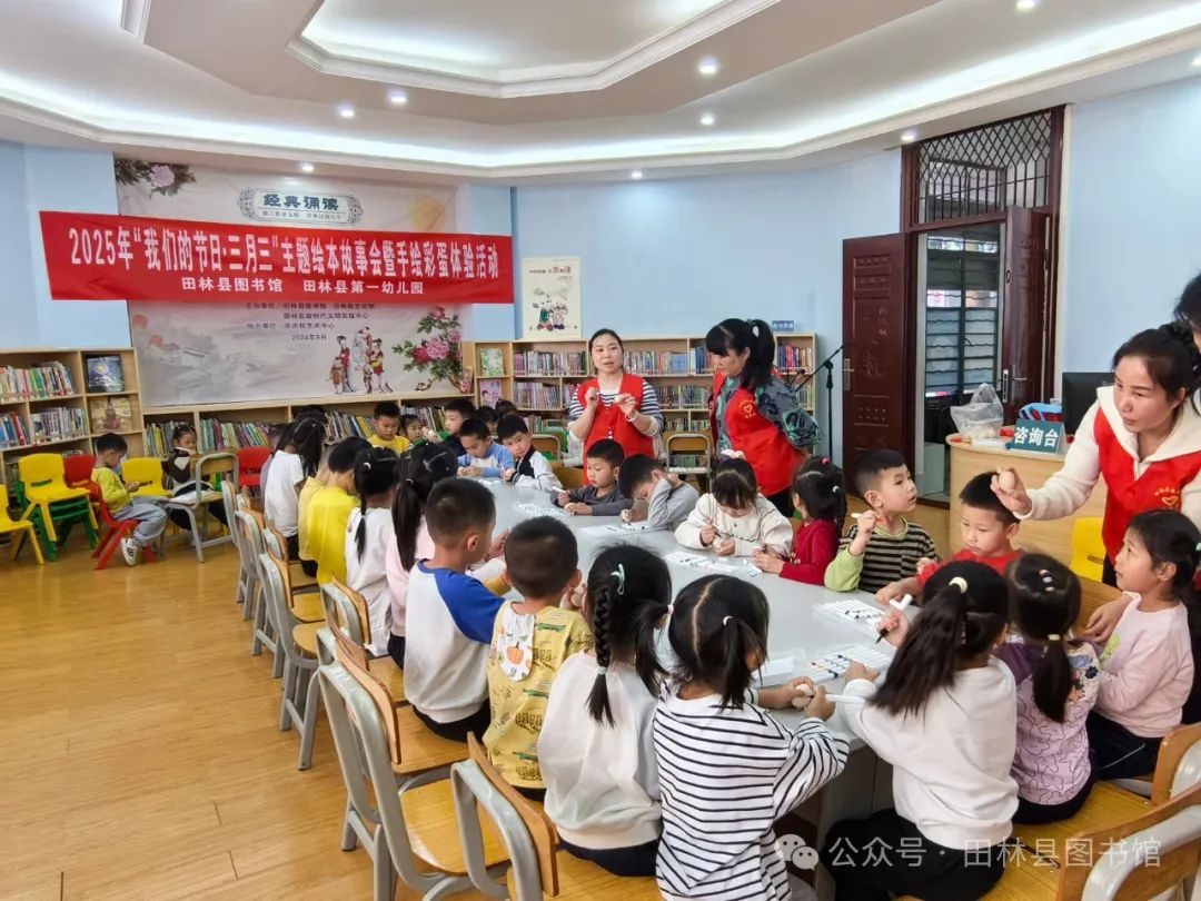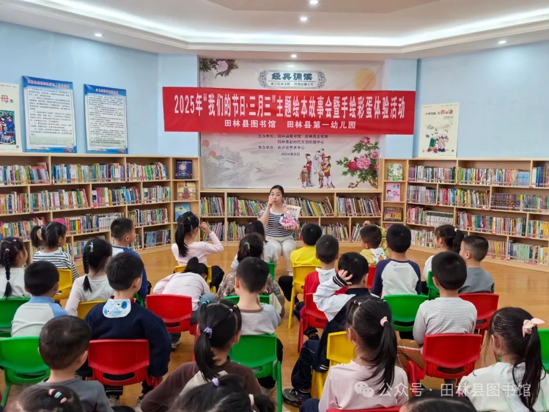 为了让幼儿了解 “广西三月三” 传统节日文化,在传统文化熏陶下成长,弘扬民族文化,激发幼儿热爱家乡、民族的情感与积极向上的精神,2025年3月24日至26日,田林县图书馆和田林县第一幼儿园在少儿阅览室联合开展2025年“多彩三月三 共筑民族情”绘本故事会暨传统民俗系列活动。系列活动内容有:2025年“我们的节日·三月三”主题绘本故事会暨手绘彩蛋活动、2025年铸牢中华民族共同体意识主题阅读活动、2025年“多彩三月三 共筑民族情”主题绘本故事会暨绣球手工体验活动。1. “我们的节日·三月三”主题绘本故事会暨手绘彩蛋活动场景