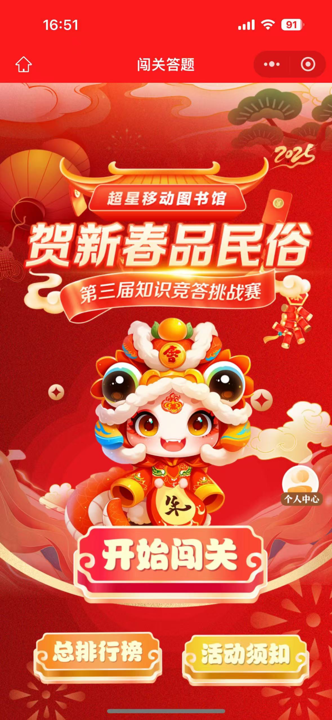 春节,中华民族最重要的传统佳节,蕴含深厚文化与历史。喜庆之际,除走亲访友、品尝美食,还可参加超星移动图书馆第三届知识竞答挑战赛,于答题闯关间领略春节独特魅力!